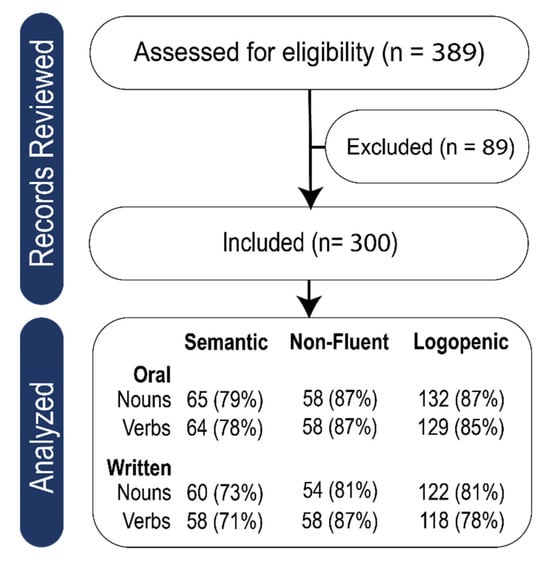 - Themistocleous, C.; Webster, K.; Afthinos, A.; Tsapkini, K. Part of Speech Production in Patients with Primary Progressive Aphasia: An Analysis Based on Natural Language Processing. Am. J. Speech Lang. Pathol. 2021, 30, 466–480. [Google Scholar] [CrossRef]