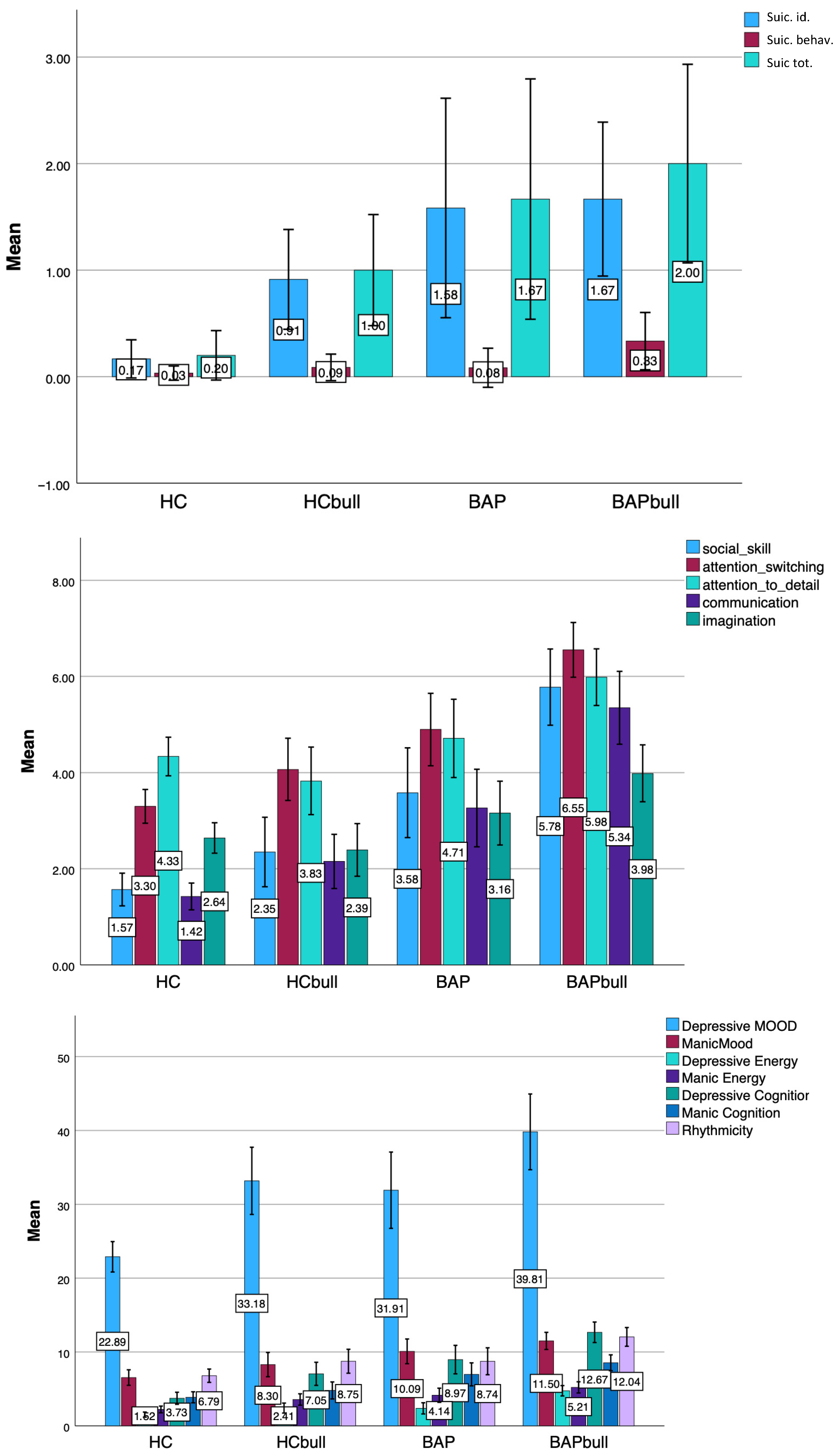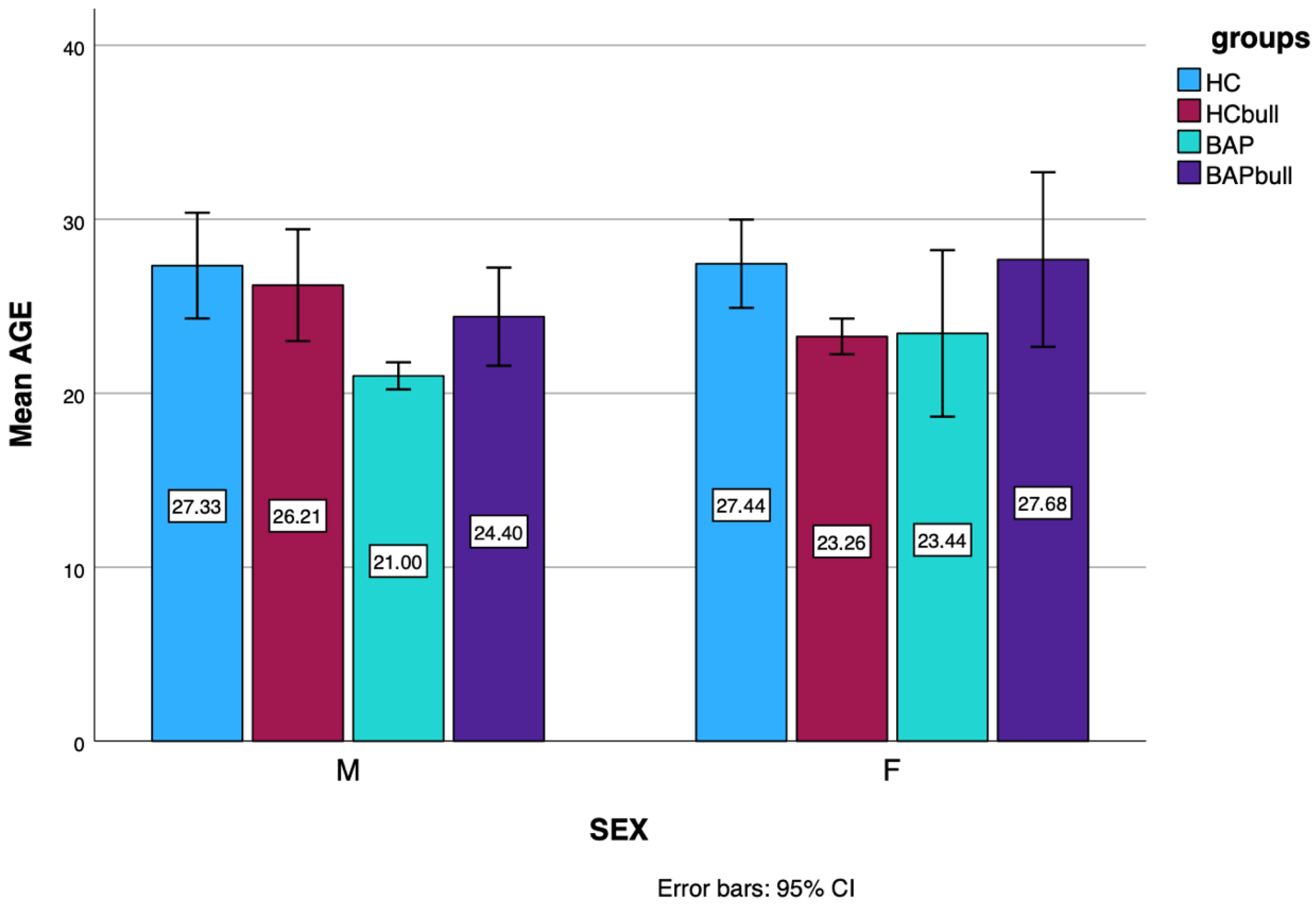 - 59 BAP individuals who experienced bullying (Bullied BAP) (F:19; M:40; mean age: 22.00 ± 5.93);