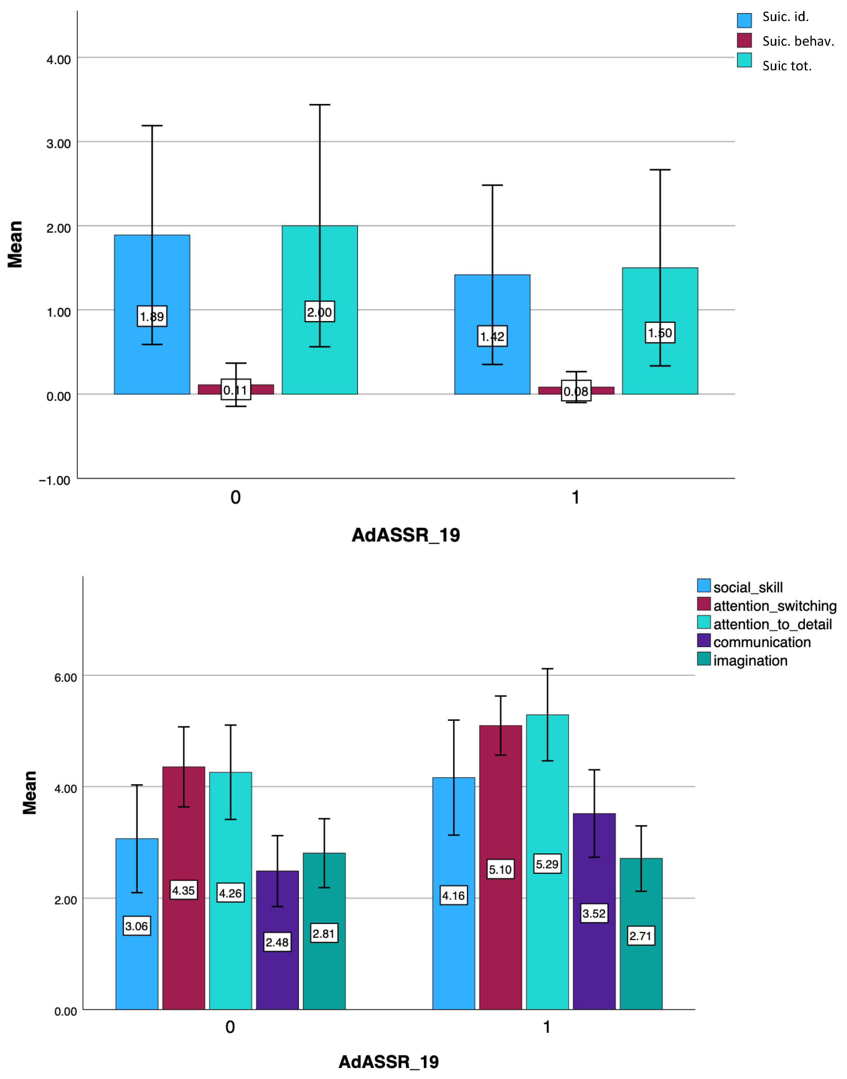 | Suic. id. | 1.54 ± 1.66 | 1.87 ± 1.67 | −0.541 | 0.593 | 1.666 | −0.934 | 0.534 |