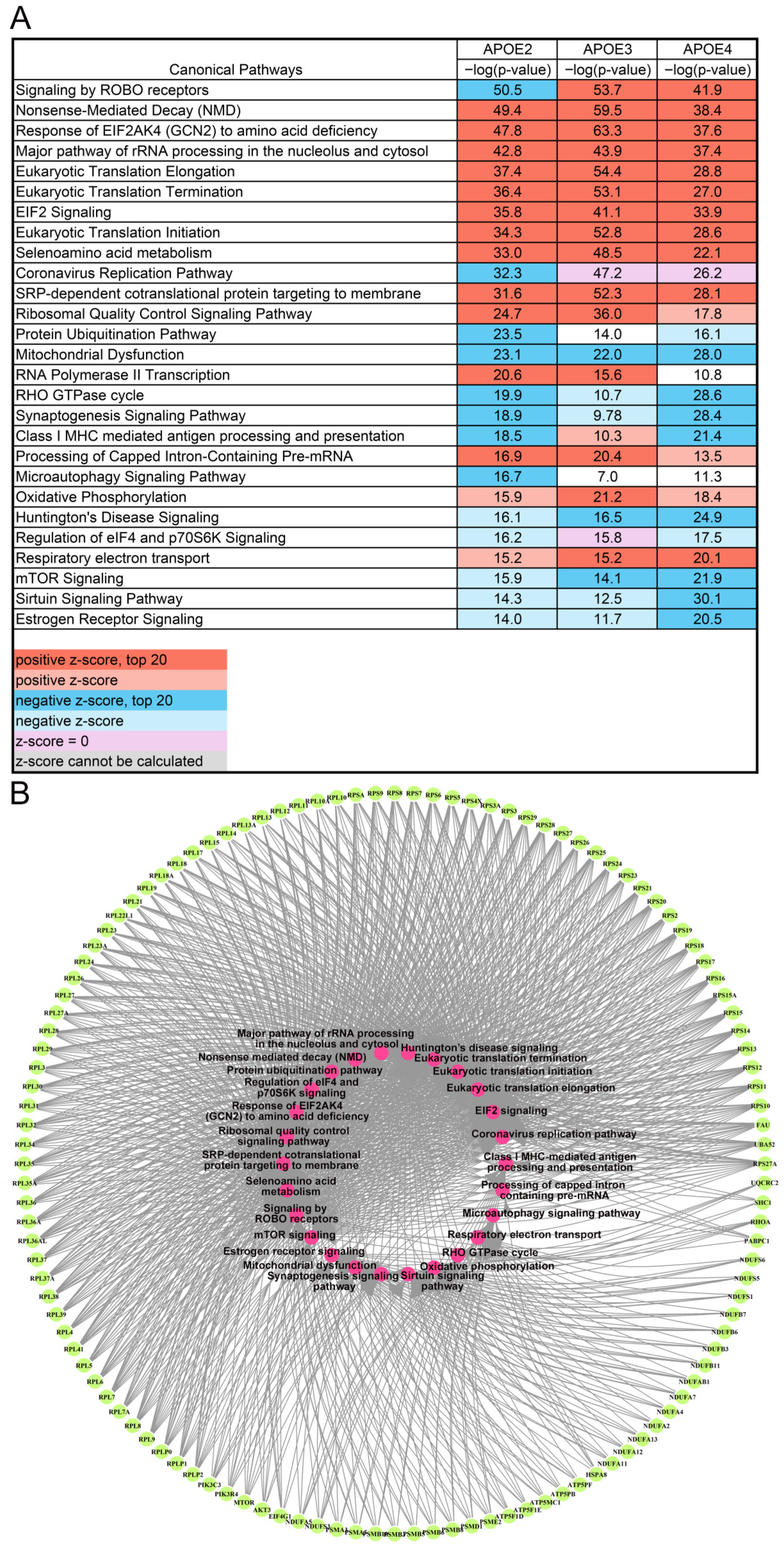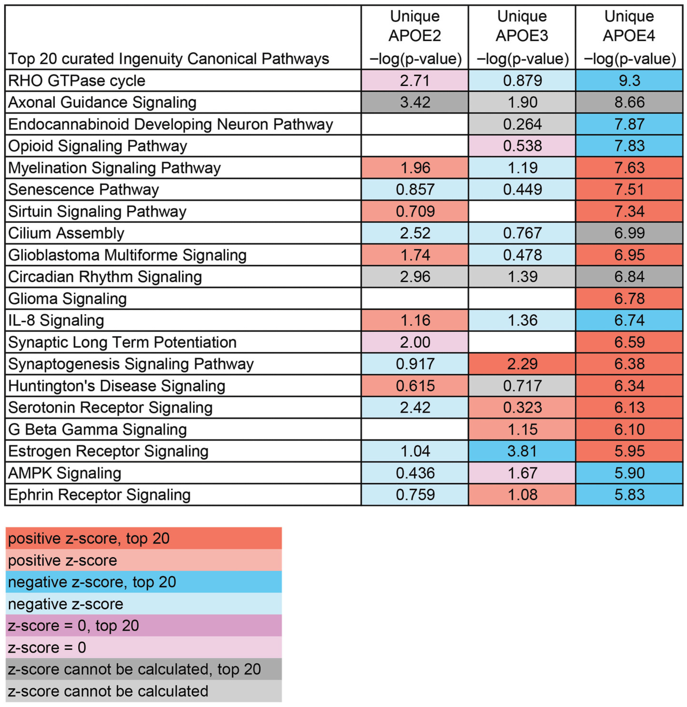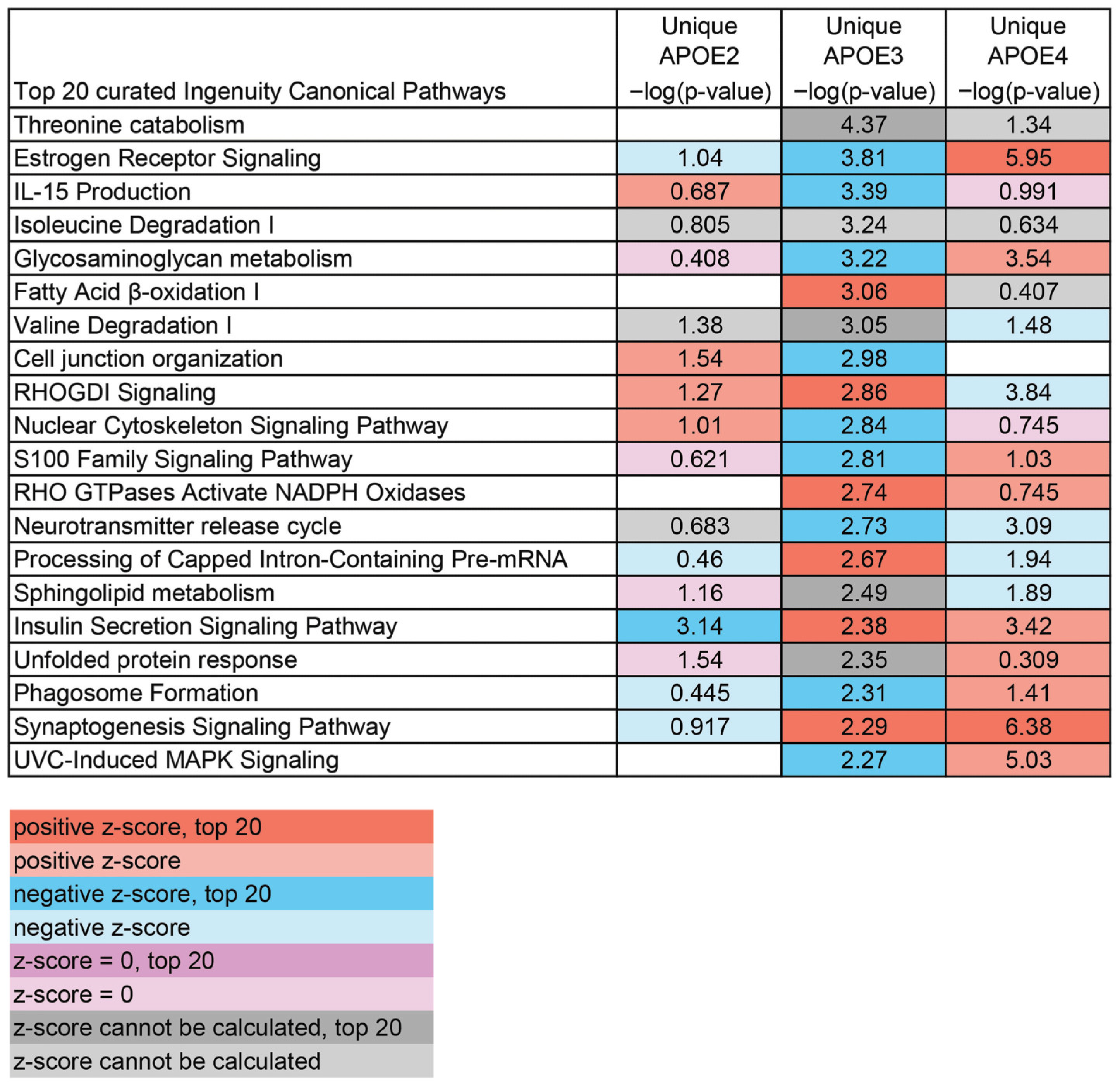 Description | APOEZ −log(p-Value) | APOE3 −log(p-Value) | APOE4 −log(p-Value) | APOE4 Unique −log(p-Value) |
