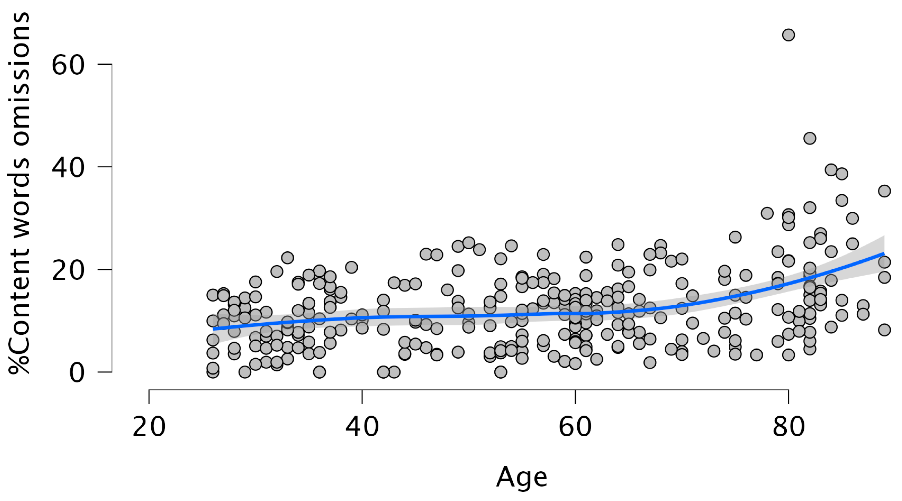 5] significant declines in several aspects of discourse production were reported after the age of 75. Regarding the production of complex sentences, when all subordinate clauses were considered together, older adults produced fewer such structures than younger participants, following a linear decline with age. To the best of our knowledge, this has not been highlighted in previous investigations, possibly due to small sample sizes or a failure to examine the entire adult lifespan. Interestingly, the analyses revealed that the decrease in the production of the different types of subordinate clauses was always linear, with a marked decline between 70 and 80 years. We also found a significant age-related decrease in the production of passive sentences. However, the production of such sentences was so small that this finding should be treated with caution. An inspection of the correlations between omissions of content words, omissions and function words and the production of the different types of subordinate clauses revealed the absence of any relation between omissions of content words and the production of such sentences. In contrast, the omissions of function words showed significant negative correlations with % Relative clauses (r = −0.174;