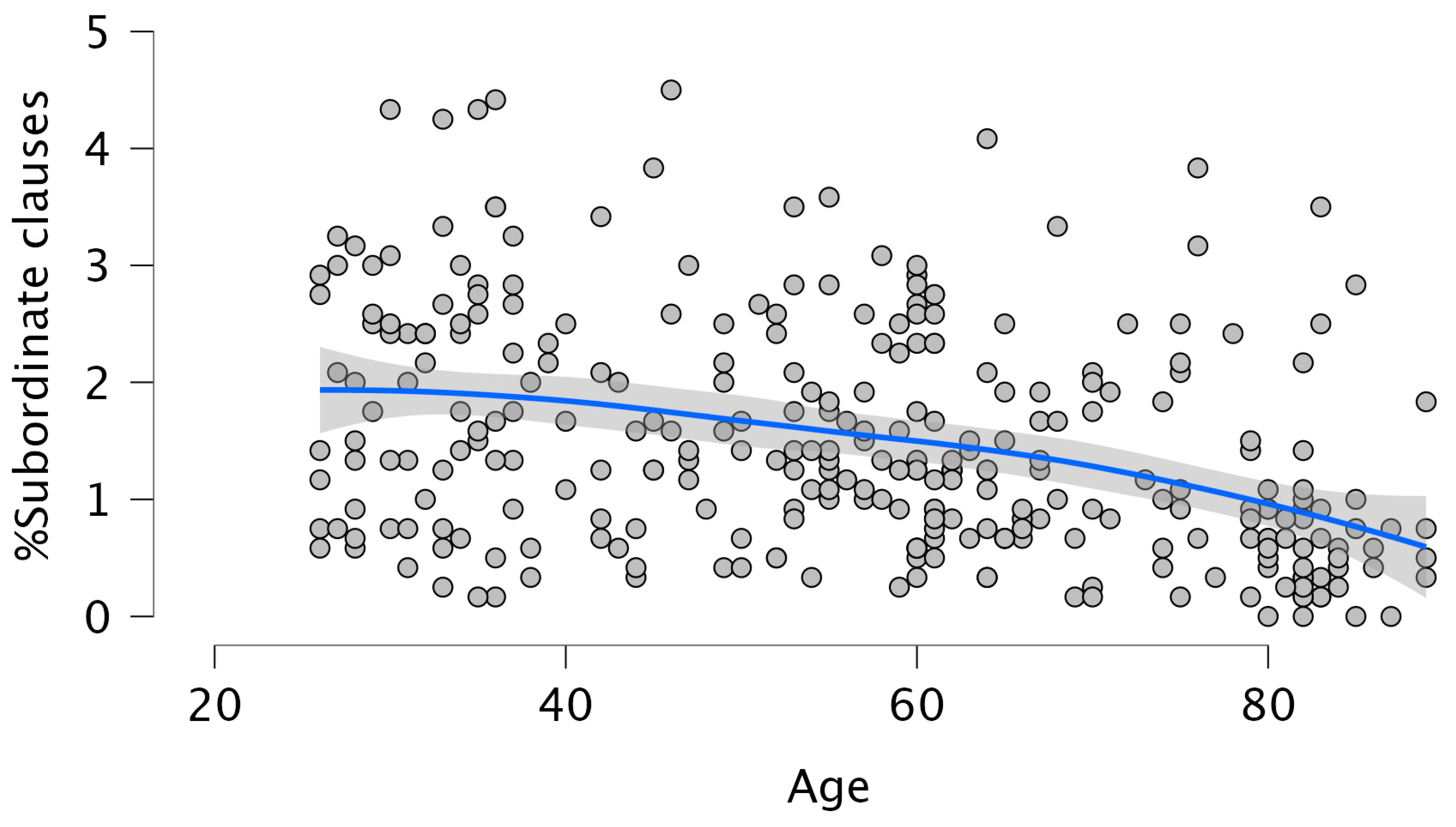Similarly, Age was negatively associated with the percentage of subordinate clauses (β = −0.369,
