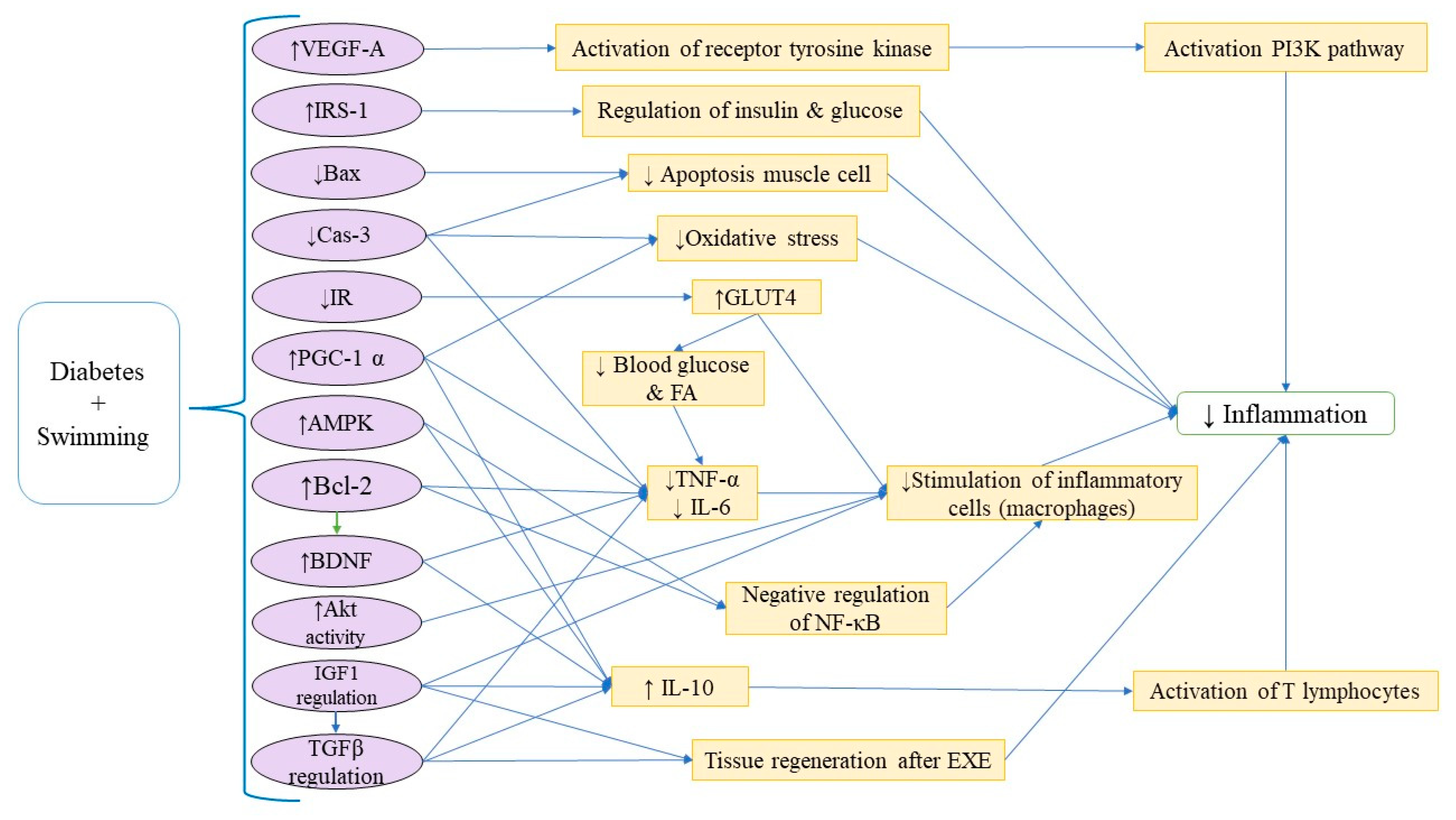 Figure 3. The effect of regular swimming practice on inflammation in diabetic patients. Regular swimming training in diabetic patients regulates TGF-β and IGF-1; reduces IR, Cas-3, and Bax; and increases PGC-1α, AMPK, Bcl-2, BDNF, IRS-1, and VEGF-A. Then, by negatively regulating NF-κB, reducing TNF-α and IL-6, increasing IL-10, and activating T lymphocytes, inflammation is reduced. Reducing insulin resistance increases GLUT4, lowers blood glucose and fatty acid levels, and reduces TNF-α and IL-6, thereby helping to reduce inflammation by decreasing the stimulation of inflammatory cells. Also, increasing PGC-1α helps reduce inflammation by reducing oxidative stress. Increasing IRS-1 reduces inflammation by regulating glucose and insulin. Swimming increases VEGF-A by activating tyrosine kinase receptors and activating the PI3K pathway, which generally reduces inflammation. Abbreviations: Protein kinase B (Akt); AMP-activated protein kinase (AMPK); Bcl-2-associated X protein (Bax); B-cell lymphoma-2 (Bcl-2); brain-derived neurotrophic factor (BDNF); Caspase-3 (Cas-3); Glucose transporter type 4 (GLUT4); insulin-like growth factor-1 (IGF-1); interleukin-6 (IL-6); interleukin-10 (IL-10); Insulin receptor substrate 1 (IRS-1); nuclear factor kappa light-chain-enhancer of activated B lymphocytes (NF-κB); peroxisome proliferator-activated receptor gamma coactivator-1 alpha (PGC-1α); Phosphoinositide 3-kinase (PI3K); transforming growth factor-beta (TGF-β); tumor necrosis factor-alpha (TNF-α); Vascular endothelial growth factor A (VEGF-A); ↑: increase; ↓: decrease.