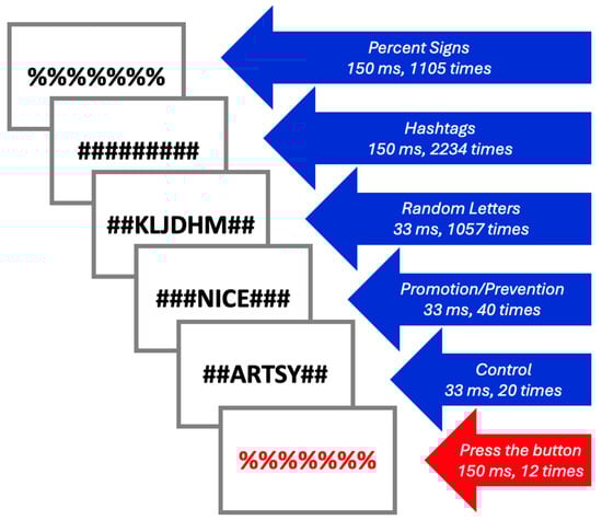 Each fMRI stimulus block contained two words from the participants’ Selves questionnaire responses (Promotion and Prevention), two semantically unrelated words from the responses of a random HC (Control), as well as random strings of letters, hashtags (#), and percent signs (%) to allow for visual masking (Figure 1). To ensure that participants were engaged throughout the task, participants were asked to press a red button when they saw red text. Each fMRI block lasted 9 min and 15 s and included over 4000 stimuli. During each block of fMRI acquisition, Promotion/Prevention and Control words were subliminally presented for a duration of 33 ms (40 times and 20 times per block, respectively), along with hashtags (150 ms, 2234 times per block), black percent signs (150 ms, 1105 times per block), random letters (33 ms, 1057 times per block), and red percent signs (150 ms, 12 times per block). The order of the blocks was randomized.