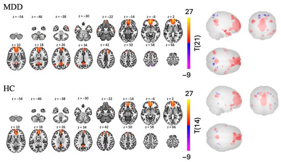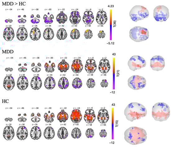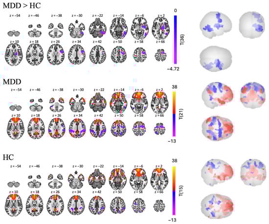 RSFC using the mPFC as a seed for MDD > HC, MDD, and HC group independently.