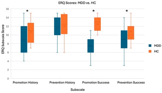 T-test results and boxplots for ERQ analysis. Subscales: Promotion History (nMDD = 19, nHC = 17), Promotion Success (nMDD = 20, nHC = 16), Prevention History (nMDD = 20, nHC = 17), and Prevention Success (nMDD = 19, nHC = 16). * There were significant group differences for all subscales, except Prevention History.