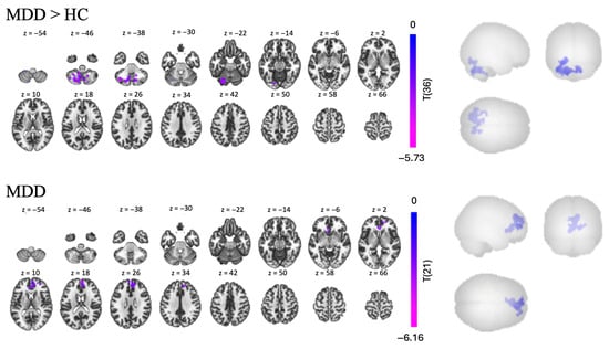 RSFC using the left hippocampus as a seed for MDD > HC, MDD, and HC groups.