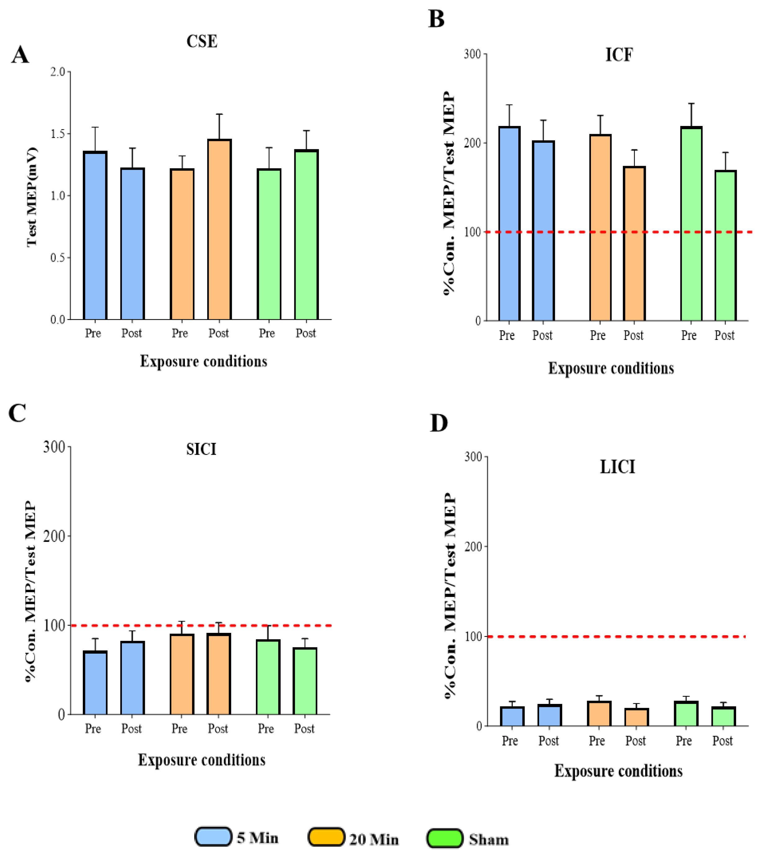 3.1. The Effects of 5G Mobile Phone EM Exposure on CSE, ICF, SICI, and LICI