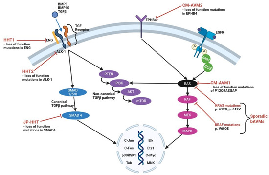 The majority of bAVMs are sporadic, with only approximately 5% of patients associated with genetic syndromes, such as hereditary hemorrhagic telangiectasia (HHT) and/or capillary malformations-arteriovenous malformations (CM-AVM) [20]. HHT (also known as Osler–Weber–Rendu syndrome) is characterized by mucocutaneous telangiectasias and AVMs. However, the familial germline mutations in the genes underlying these syndromes have shed important insights into the signaling pathways and networks that contribute to the pathophysiology of bAVM formation. These families of genes include the following: transforming growth factor-β (TGF-β), endoglin (ENG), activin receptor-like kinase (ALK1), SMAD, KRAS, and MAPK [20], and are involved in the regulation of angiogenesis [21] (Figure 1). Approximately 5–20% of HHT patients have at least one bAVM, with multiple bAVMs being a predictive factor of HHT [22,23,24]. HHT-associated bAMVs tend to have a smaller nidus than sporadic bAVMs, with no statistical significance in age at diagnosis, prevalence of intracranial hemorrhage (ICH), or age at first ICH [25]. There are three types of HHT, characterized by mutations in members of the TGFβ/BMP signaling pathway: (1) type 1 results from loss-of-function (LoF) mutations in one copy of endoglin (ENG) [26,27]; (2) type 2 results from LoF mutations in activin A receptor like type 1 (ACVRL1 or ALK1+/−) [28]; and (3) mutations in SMAD4 cause a combined syndrome of juvenile polyposis and HHT (JP-HHT), accounting for 2% of HTT cases [29] (Figure 1).