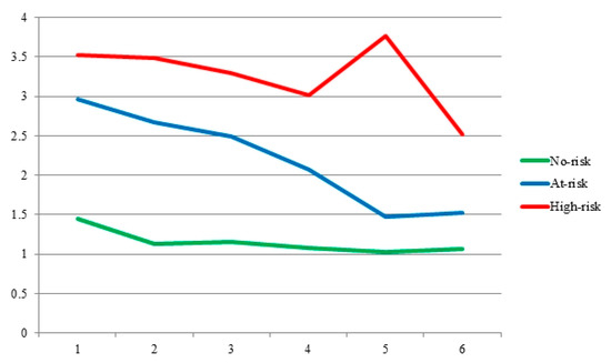 Table 2 shows the descriptive statistics (means and standard deviations) for the problematic QQ use symptoms and total QQ addiction score. Considering the classification by the risk level, the No-risk class demonstrated comparatively lower scores for all the variables than the At-risk and High-risk classes. Additionally, the High-risk class demonstrated the highest scores for all problematic QQ use symptoms and total QQ addiction scores. Based on the symptoms and addiction scores, the three classes were labeled veritably as No-risk, At-risk, and High-risk (Figure 1).