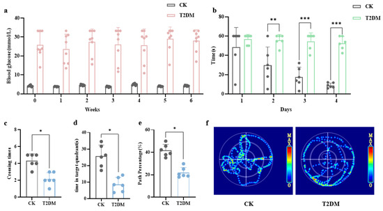 Then, the mice were randomly divided into two groups and housed with three or two mice per cage. To establish a type 2 diabetes mellitus (T2DM) mouse model, thirty mice were fed a high-sugar, high-fat diet for six weeks to induce insulin resistance. Subsequently, the mice were administered streptozotocin (STZ, 30 mg/kg/day, Sigma-Aldrich (St. Louis, MO, USA, S0130), dissolved in citrate buffer (0.1 M, pH = 4.5), via intraperitoneal injection for five consecutive days [47]. Control group mice were fed a regular diet and received an equivalent volume of sodium citrate buffer. Two weeks post-injection, blood glucose levels were measured from the tail tip. Mice were considered diabetic when fasting blood glucose reached ≥11.1 mmol/L. Six weeks after the final STZ injection, they were subjected to behavioral tests and molecular analyses. Before tissue collection, animals were anesthetized with 2–3% isoflurane in oxygen and euthanized by cervical dislocation.