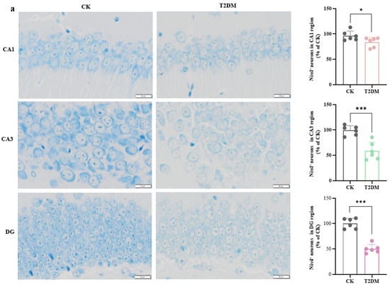 As is well known, diabetes is a chronic disease that severely affects human and animal health. With in-depth research, scientists have found that diabetes is closely related to neurodegenerative diseases such as Alzheimer’s disease and is one of the important causes of cognitive impairment [50]. Diabetes can induce neuroinflammation [51,52], cause neuronal apoptosis and necrosis [53,54], and activate autophagy [55,56,57], thereby causing neuronal damage and inducing cognitive impairment.