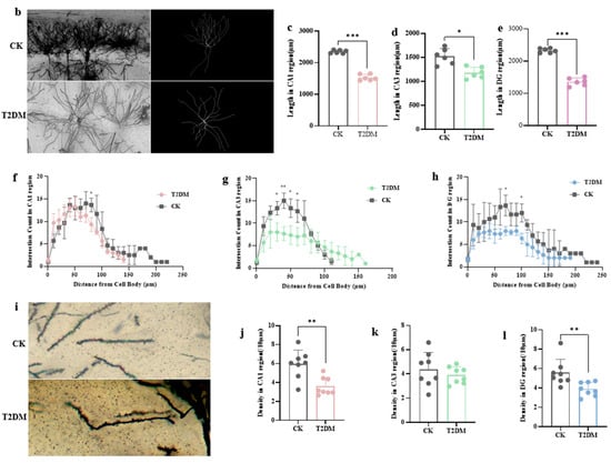 Figure 2i shows dendritic spines captured at high magnification, and the density of dendritic spines was analyzed after processing the captured spines with ImageJ. The density of dendritic spines in the CA1 region (j), CA3 region (k), and DG region (l) of the T2DM group was lower than that of the CK, with varying degrees of difference in each area.