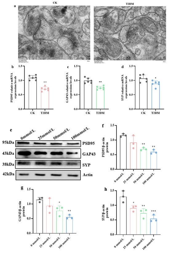 Synaptic damage in the hippocampus of diabetic mice and hippocampal neurons exposed to high glucose. (a) Synaptic structure in the hippocampus of mice detected by electron microscopy. (Scale bar = 200 nm) (b–d) Relative mRNA expression levels of PSD95, GAP43, and SYP in the hippocampal tissue of mice. (e) Western blot analysis of synaptic protein expression in hippocampal neurons exposed to varying high glucose. (f–h) Expression levels of PSD95, GAP43, and SYP protein in hippocampal neuronal cells. Data are presented as mean ± standard deviation. * p < 0.05, ** p < 0.01, *** p < 0.001, compared with the control group.