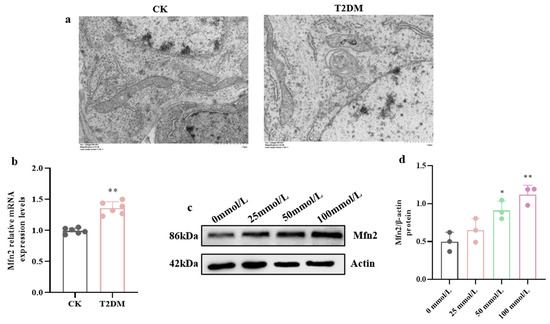 Interestingly, according to the results of qRT-PCR and WB, we found that Mfn2 expression was significantly up-regulated in the hippocampal tissues of diabetic mice (Figure 4b) and in hippocampal neurons exposed to high glucose (Figure 4c,d).