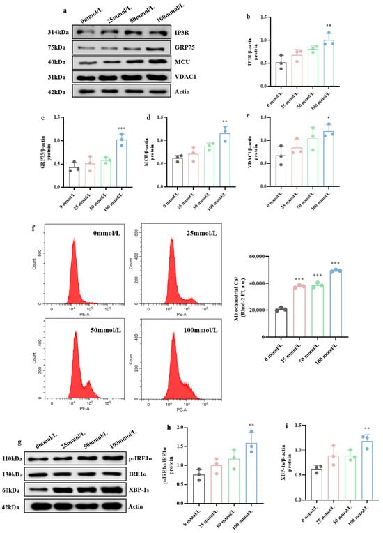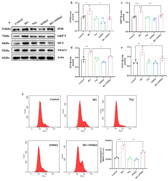 Simultaneously, Western blotting (Figure 5a–e) revealed elevated expression of MAM-localized Ca2+-transport proteins under high glucose: GRP75 was markedly increased (p < 0.001), IP3R and MCU were significantly up-regulated (p < 0.01), and VDAC1 was elevated (p < 0.05), indicating disrupted Ca2+ homeostasis at MAM. Flow cytometry (Figure 5f) further showed that mitochondrial Ca2+ levels were profoundly higher in the high-glucose group than in control group (p < 0.001), confirming high-glucose-induced mitochondrial Ca2+ overload.