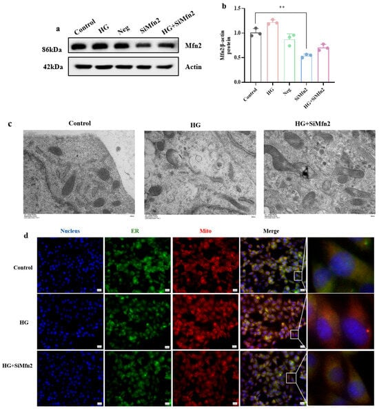 Mfn2 knockdown rectifies MAM dysfunction induced by high glucose. (a,b) Validation of Mfn2 knockdown efficiency. (c) Improvement in mitochondrial and ER damage and MAM abnormalities after Mfn2 knockdown under high-glucose conditions. (Scale bar = 1.0 μm) (d) Fluorescence colocalization showing increased MAM in hippocampal neuronal cells exposed to high glucose and improvement after Mfn2 knockdown. (Scale bar = 20 μm) (n = 3). Data are presented as mean ± standard deviation. ** p < 0.01.