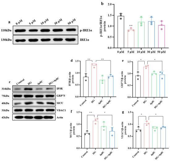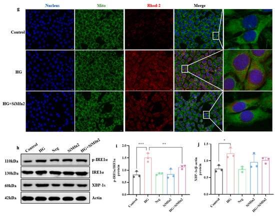 We next applied 4μ8C to block IRE1α phosphorylation and suppress the ERS pathway. Western blotting (Figure 10a,b) showed that 5 μM 4μ8C significantly inhibited the IRE1α pathway (p < 0.01). When ERS was restrained, the high-glucose-induced overexpression of Ca2+-transport proteins in MAM was attenuated (Figure 10c–g): IP3R returned almost to control levels (p < 0.01), and GRP75, MCU, and VDAC1 were markedly reduced (p < 0.05). Flow cytometry (Figure 10h,i) revealed that the Rhod-2/AM fluorescence intensity in the HG+4μ8C group was markedly lower than that in the HG group (p < 0.01), indicating that inhibition of the IRE1α pathway effectively alleviated high-glucose-induced mitochondrial Ca2+ overload. Immunofluorescence (Figure 10j) further confirmed this observation: the number of colocalized puncta between Rhod-2/AM and the mitochondrial marker was substantially reduced after 4μ8C treatment.