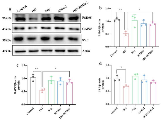Mfn2 knockdown alleviates high-glucose-induced hippocampal synaptic plasticity damage. (a) Expression levels of synaptic-related proteins. (b–d) Expression levels of PSD95, GAP43, and SYP protein in hippocampal neuronal cells. Data are presented as mean ± standard deviation. * p < 0.05, ** p < 0.01.