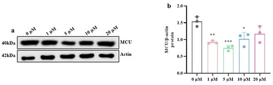 We employed 5 μM MCU-i4 (MCE, Shanghai, China, HY-138620) to suppress MCU protein expression and 5 μM 4μ8C (Selleck, Shanghai, China, S7272) to inhibit IRE1α phosphorylation. First, the concentration range of each inhibitor was preliminarily defined by CCK-8 assays for cell viability. Cells were then seeded in plates; after attachment, the indicated concentrations of MCU-i4 or 4μ8C were added. Following 48 h of treatment, cells were harvested for protein extraction to assess inhibitor efficacy and to perform downstream analyses.