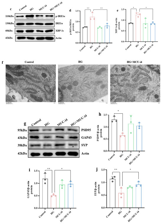 MCU inhibition attenuates high-glucose-induced ERS. (a) Western blot results of MCU protein expression. (b) Quantification of MCU protein expression. (c) Western blot results of ERS-related protein expression. (d,e) Quantification of p-IRE1α/IRE1α and XBP-1s protein expression. (f) Improvement in ERS after suppressing the expression of MCU protein in high-glucose conditions. (Scale bar = 1.0 μm) (g) Expression levels of synaptic-related proteins. (h–j) Expression levels of PSD95, GAP43, and SYP protein in hippocampal neuronal cells. Data are presented as mean ± standard deviation. * p < 0.05, ** p < 0.01, *** p < 0.001.