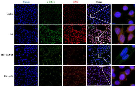 Finally, to examine the interplay between MCU and p-IRE1α under high glucose, we performed immunofluorescence labeling. Figure 11 shows that exposure to 100 mmol/L glucose markedly increased MCU expression and intensified its fluorescent signal, while p-IRE1α levels and fluorescence were also elevated. Treatment with MCU-i4 to inhibit MCU expression attenuated the high-glucose-induced rise in p-IRE1α fluorescence, and application of 4μ8C to suppress IRE1α phosphorylation reduced the glucose-evoked increase in MCU fluorescence. These observations indicate a reciprocal regulatory relationship between MCU and p-IRE1α under high-glucose conditions.