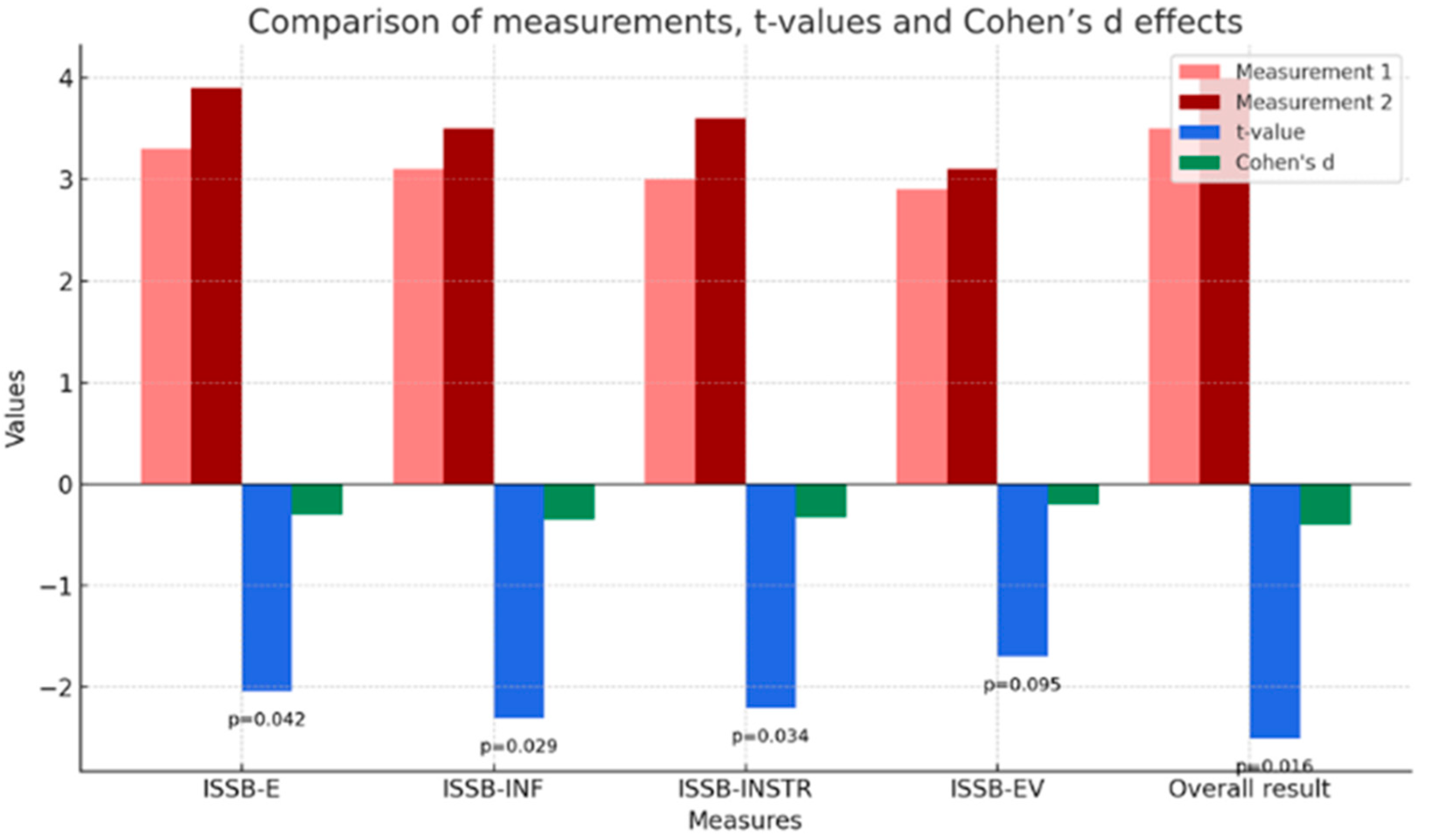 Figure 3 presents a comparison of measurement results, t-values, and Cohen’s d effects for the measures of social support. Measurement 2 values are slightly higher than Measurement 1 values, suggesting a small increase in values in the new condition. Cohen’s d effects are small, suggesting a weak effect of the change in condition. Only the overall score shows a significant difference (