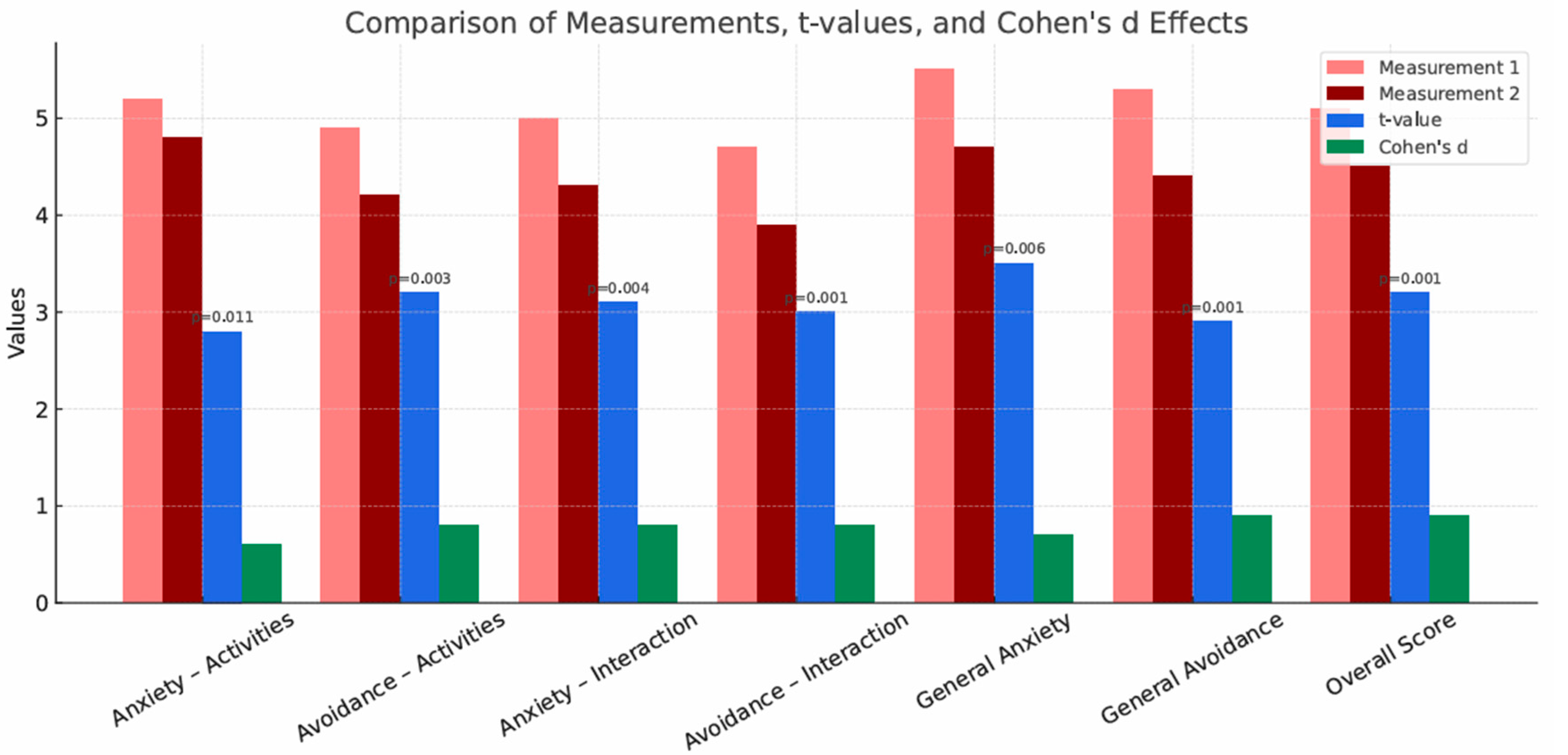 p values < 0.05 for all key comparisons indicate statistical significance of the results, confirming the effectiveness of the RPG intervention in reducing social anxiety and increasing support. The analysis of the collected data shows that participants reacted differently to participating in RPG sessions. Individuals with higher levels of social anxiety at baseline reported some difficulty in fully engaging in narrative interactions, but their comfort gradually increased.