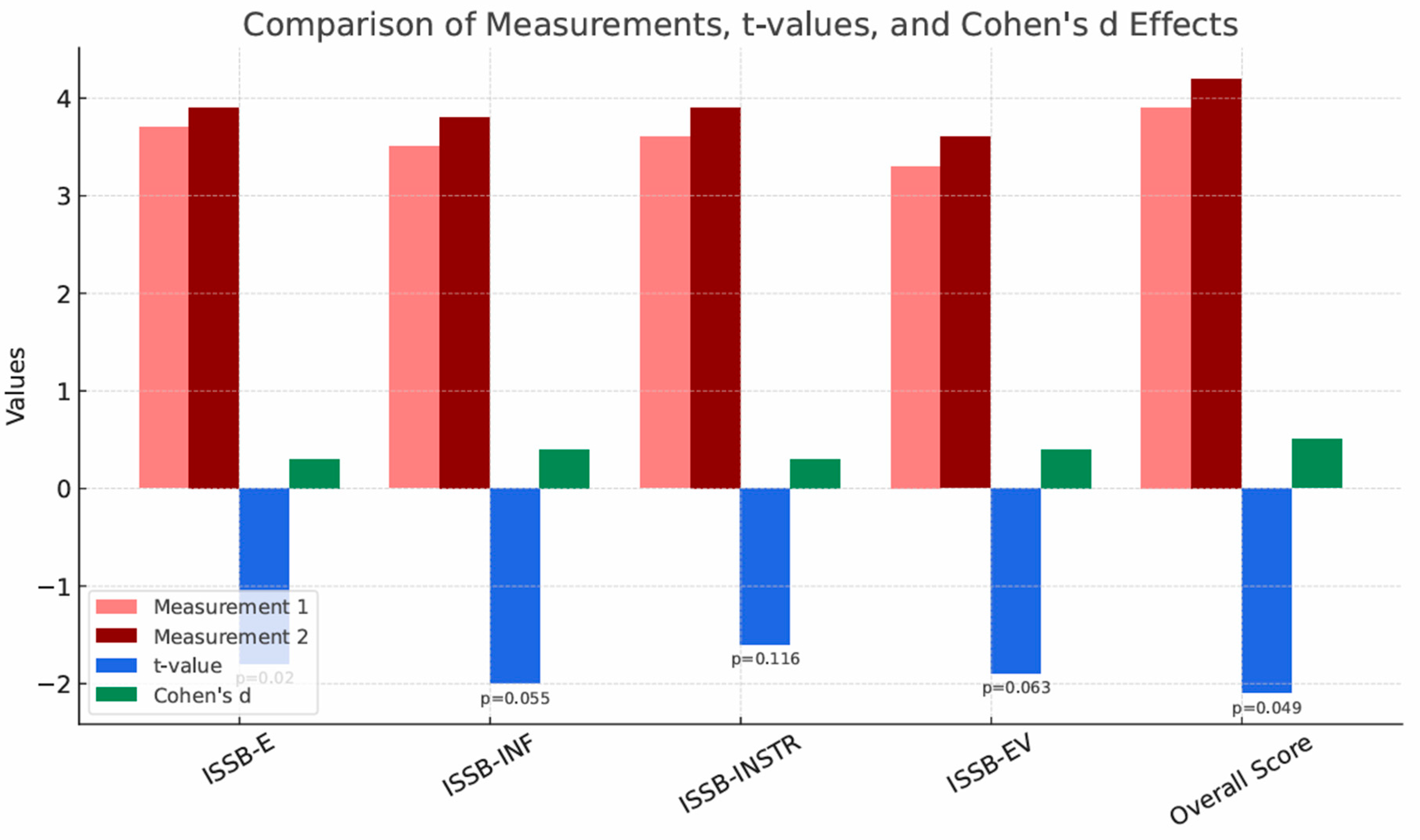p = 0.016, d = −0.618) has the largest effect size, meaning that the difference between pre- and post-study scores is not only significant but also has a medium effect size.