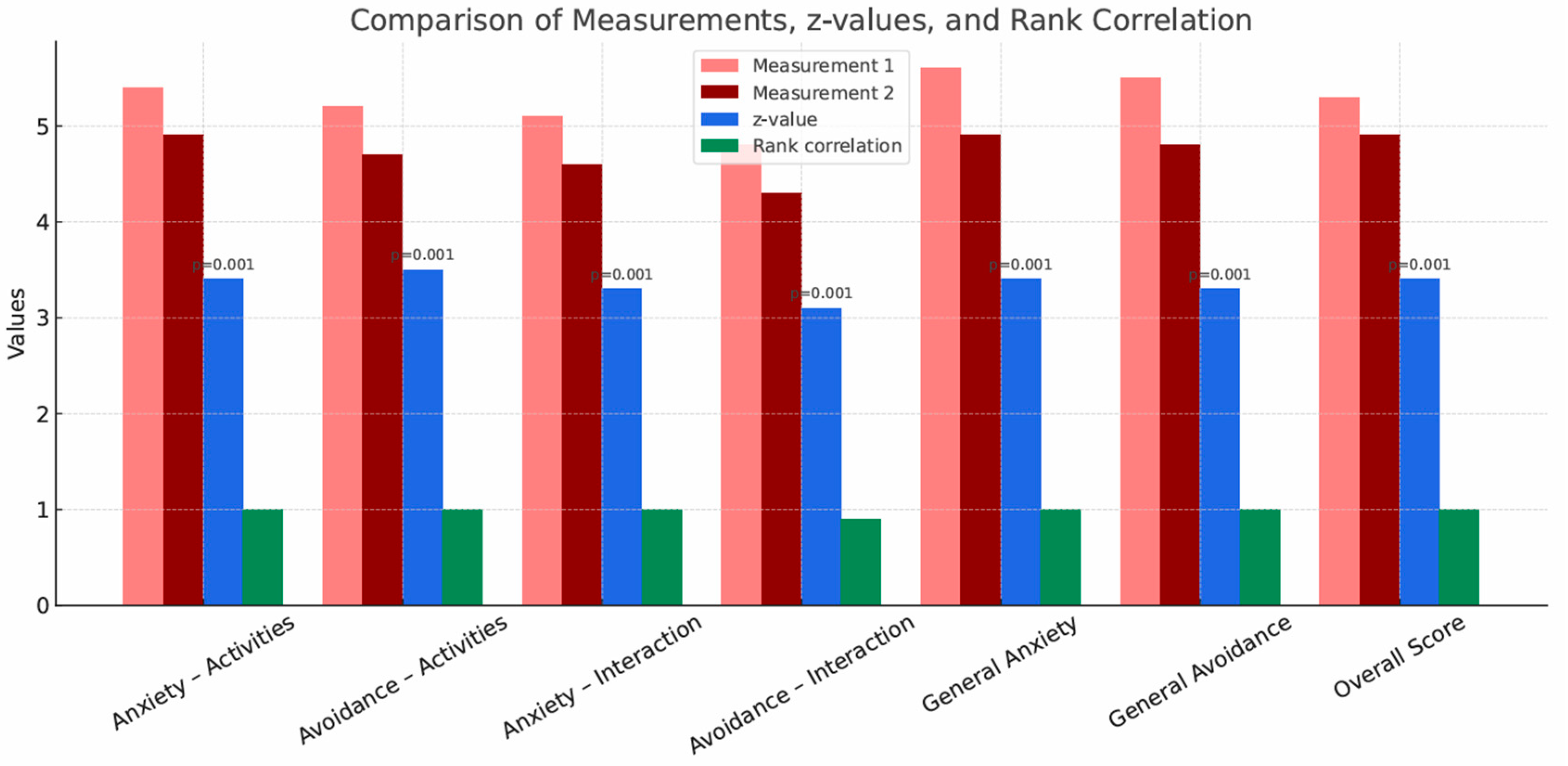 p values are less than 0.001, indicating strong differences. Rank correlations were high (0.900–1.000), indicating strong effects of changing the conditions. The post-intervention measurement condition was associated with significant decreases in anxiety and avoidance across both activities and interactions.
