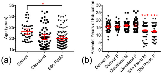 Ages and SES of Participants in each study site. (a) Scatter plot of participants’ age in the Denver (●), Cleveland (■), and São Paulo (▼) sites. (b) Scatter plot of participants’ SES in the Denver, Cleveland, and São Paulo sites, as assessed by years of education of their mothers (M) and fathers (F). Red lines represent means ± 95% CI; “*” represents p < 0.05 and “***” p < 0.001.