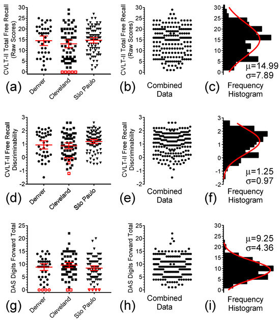 Distribution of individual baseline test scores for the two sub-measures of the CVLT-II-sf and the DAS-II Digits Forward from the pilot memantine study in Denver (●), and from the Cleveland (■), and São Paulo (▼) sites for the follow-up memantine study. (a) Scatter plots of Total Recall scores in Denver, Cleveland, and São Paulo (n = 85). (b) Combined Total Recall scores for the three study sites. (c) Frequency histogram and single Gaussian curve fitting for data depicted in (b). (d) Scatter plots of Total Recall Discriminability scores in Denver, Cleveland, and São Paulo. (e) Combined scores for the three study sites. (f) Frequency histogram and single Gaussian curve fitting for the combined data. (g,d) Scatter plots of the DAS-II Digits Forward scores, (h) Combined scores. (i) Frequency histogram and single Gaussian curve fitting for the combined data. Solid symbols represent the computed data, open symbols are the excluded floor scores, and middle solid lines and error bars in the graphs represent mean ± 95% confidence interval (CI).