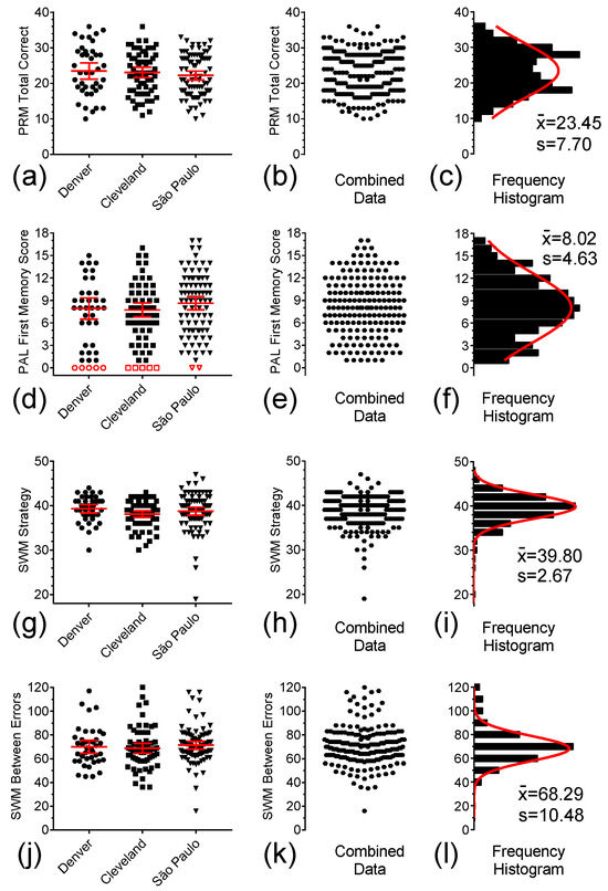 Distribution of individual baseline test scores for the CANTAB PRM, CANTAB PAL, and CANTAB SWM Strategy and Between Errors in Denver (●), and from the Cleveland (■), and São Paulo (▼) sites. (a,d,g,j) Scatter plots of these tests scores, respectively. (b,e,h,k) Combined scores for each of these four measures at the three study sites. (c,f,i,l) Frequency histograms for combined scores and single Gaussian curve fittings of the combined data for each of the four measures in Denver, Cleveland, and São Paulo. Solid symbols represent the computed data, open symbols are the excluded floor scores, and middle solid lines and error bars in the graphs represent mean ± 95% CI.