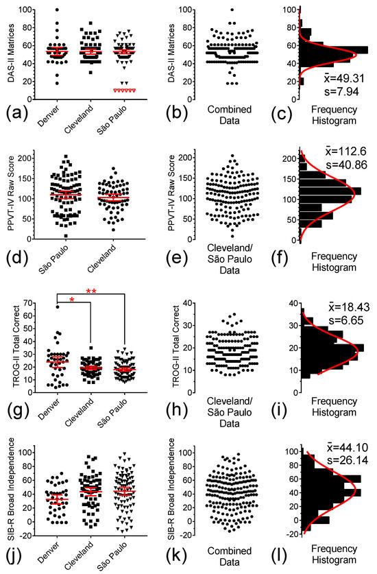 Distribution of individual baseline test scores for DAS-II Matrices, PPVT-IV, TROG-II, and SIB-R Broad Independence in Denver (●), and from the Cleveland (■), and São Paulo (▼) sites. (a,d,g,j) Scatter plots of DAS-II Matrices scores, CANTAB PRM Total Correct answers, TROG-II Total Correct choices, and SIB-R Broad Independence scores, respectively. (b,e,h,k) Combined scores for each of these four measures at the three study sites. (c,f,i,l) Frequency histograms for combined scores and single Gaussian curve fittings of the combined data for each of the four measures in Denver, Cleveland, and São Paulo. Solid symbols represent the computed data, open symbols are the excluded floor scores, and middle solid lines and error bars in the graphs represent mean ± 95% CI. The symbols “*” and “**” indicate “p” values < 0.05 and <0.01.