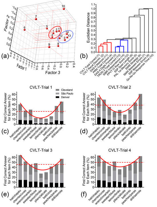 Principal components and hierarchical clustering analyses of test battery’s measures and CVLT-II-sf distribution of responses at baseline in Denver, Cleveland, and São Paulo. (a) 3-D scatter plot representation of the three principal factor coordinates calculated for the 14 core measures of the test battery. (b) Hierarchical clustering of the measures based on the Euclidian distance between variables. Ovals in 3-D plot and thick lines in the dendrogram represent two emergent cognitive domain clusters. (c–f) Bar graph representations of successful memory recall for words as a function of their position in the CVLT-II-sf word list in trials 1–4, respectively. The U-shaped curves are second-order polynomial curve fit of the combined CVLT-II-sf serial position distribution of study participants in Denver, Cleveland, and São Paulo.