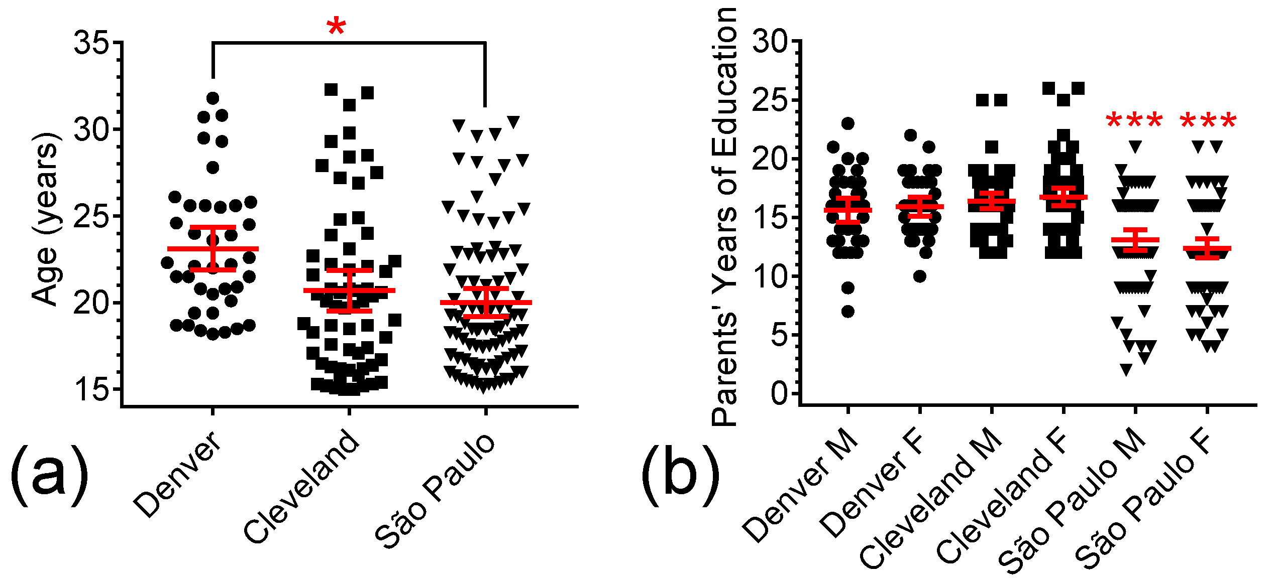 The number of years of formal school education for the participant’s parents was used as a proxy for socioeconomic status (SES). The values of this measure for each site cohort are illustrated in Figure 1b. Once again, we found that site location had a significant effect on group means (F(2, 369) = 52.693, p < 0.0001). The mean number of years of education of the mothers and fathers from Denver (15.9 and 15.6 years, respectively) were statistically comparable to those from Cleveland (16.4 years; p = 1.0000, and 16.7 years; p = 1.0000). In contrast, the SES of both participants from Denver and those from Cleveland was significantly higher than for those from São Paulo, as quantified by the mean number of years of mother education (13.1 years; p = 0.0003 and p < 0.0001; respectively) and years of father education (12.4 years; p < 0.0001 and p < 0.0001, respectively).