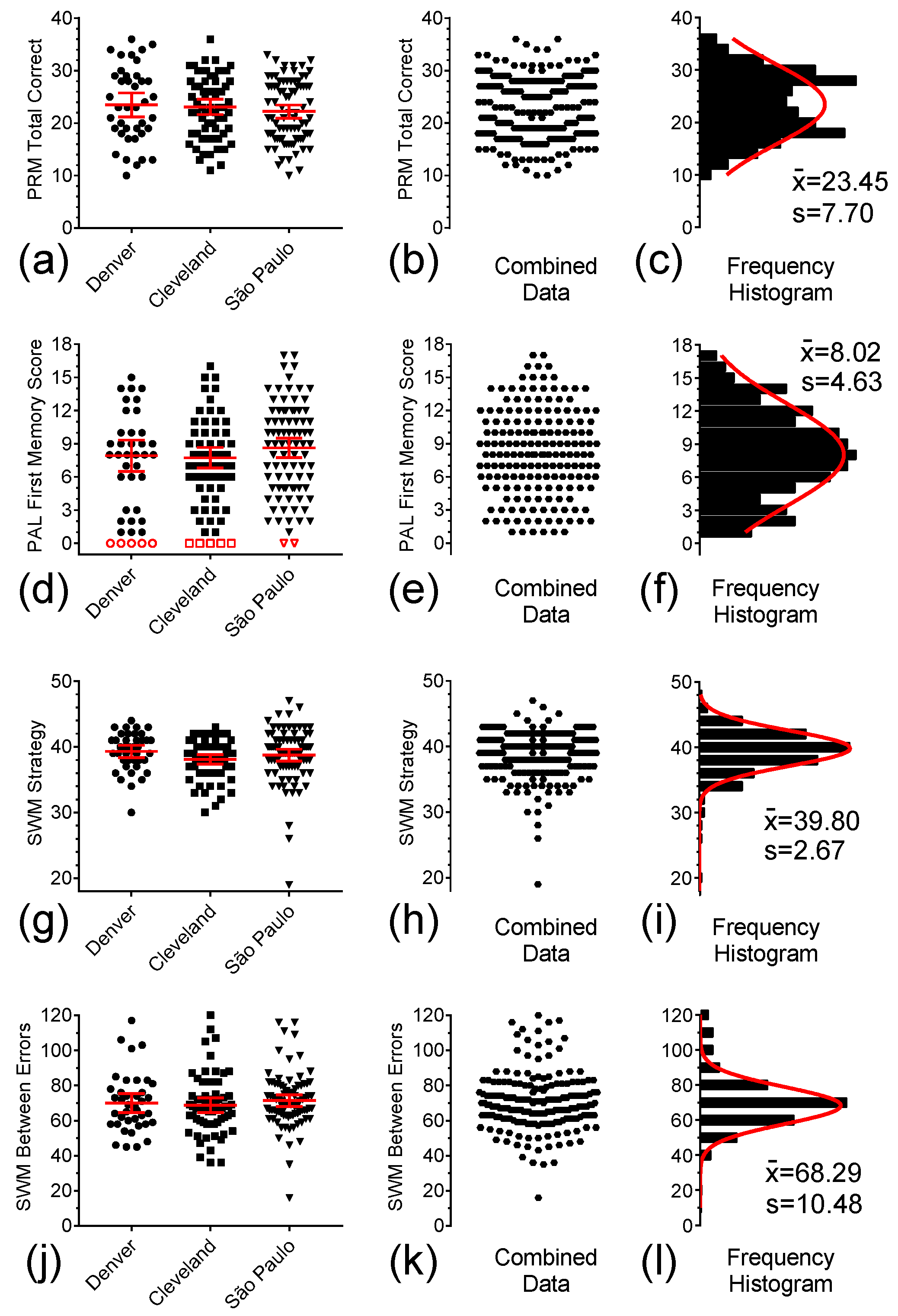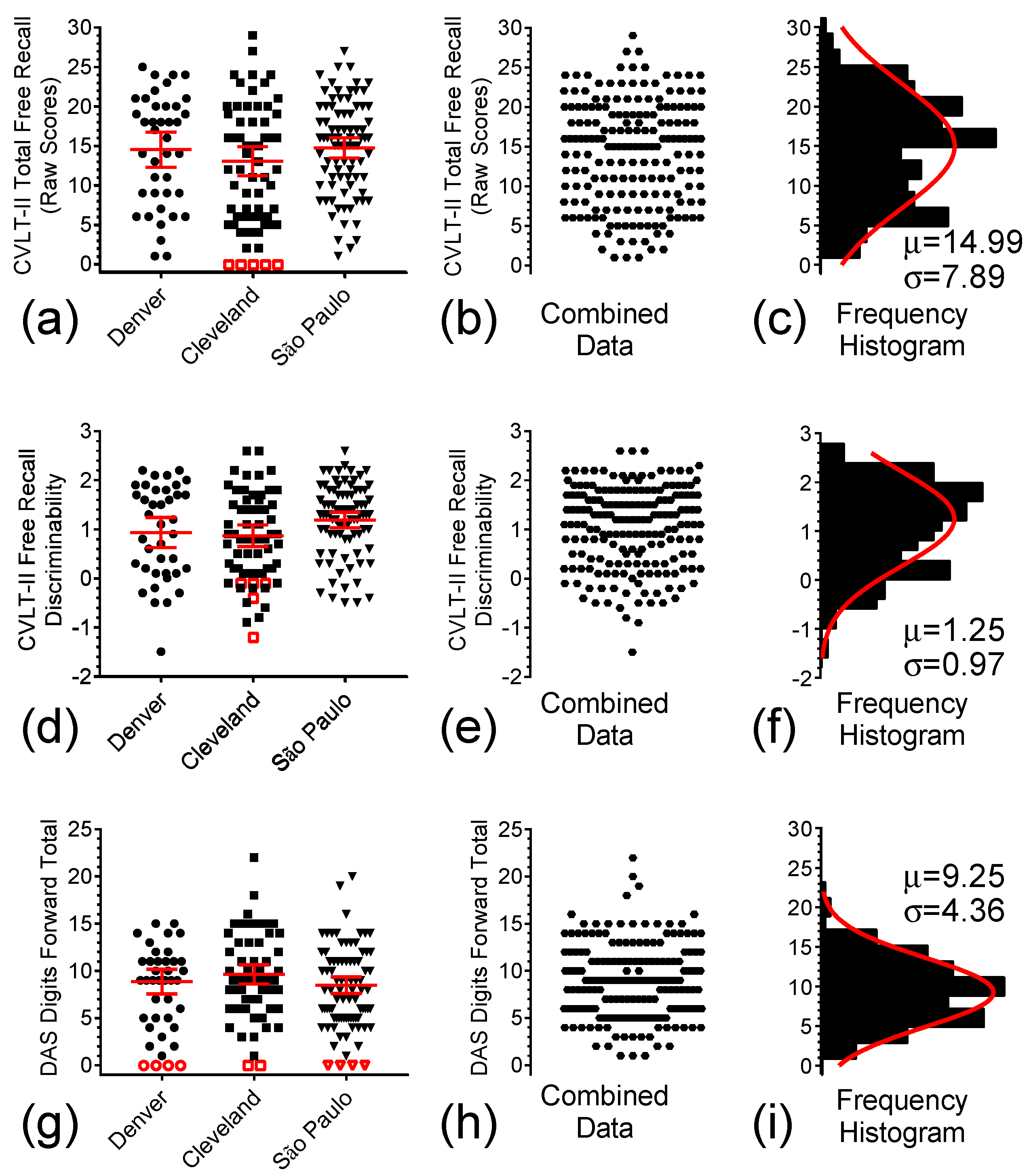 Figure 2a–f depicts the individual Free-Recall Total raw scores and Free-Recall Discriminability scores for the participants in the three study sites. (In this and all similar graphs in this paper, open symbols represent floor scores, which were not used in statistical comparisons between groups.) ANOVA of the data in Figure 2a did not reveal any significant difference in the mean Free-Recall Total raw scores among the three study sites (See Table 1 for statistical results). Consequently, in Figure 2b, the data of these sites were combined, which generated the histogram shown in Figure 2c. The non-linear curve fitting of the frequency histogram resulting from these data produced a Gaussian curve with a mean sample value ( x ¯ ) of 14.99 (95% CI 12.67 to 17.15) and standard deviation (s) of 7.89. In panels d-f of Figure 2, a similar analysis was performed for the Free-Recall Discriminability scores. (Note that, for consistency, the open symbols here refer to the data from the same individuals with floor performance as assessed by the Free-Recall Total raw scores.) Although the p value was very close to reaching significance criterion, no significant difference was found for the mean Free-Recall Discriminability scores among the three study sites. Therefore, data were combined in Figure 2e, and these combined data were fit with a Gaussian function with x ¯ = 1.26 (95% CI 1.04 to 1.49) and s = 0.97 (95% CI 0.76 to 1.27).