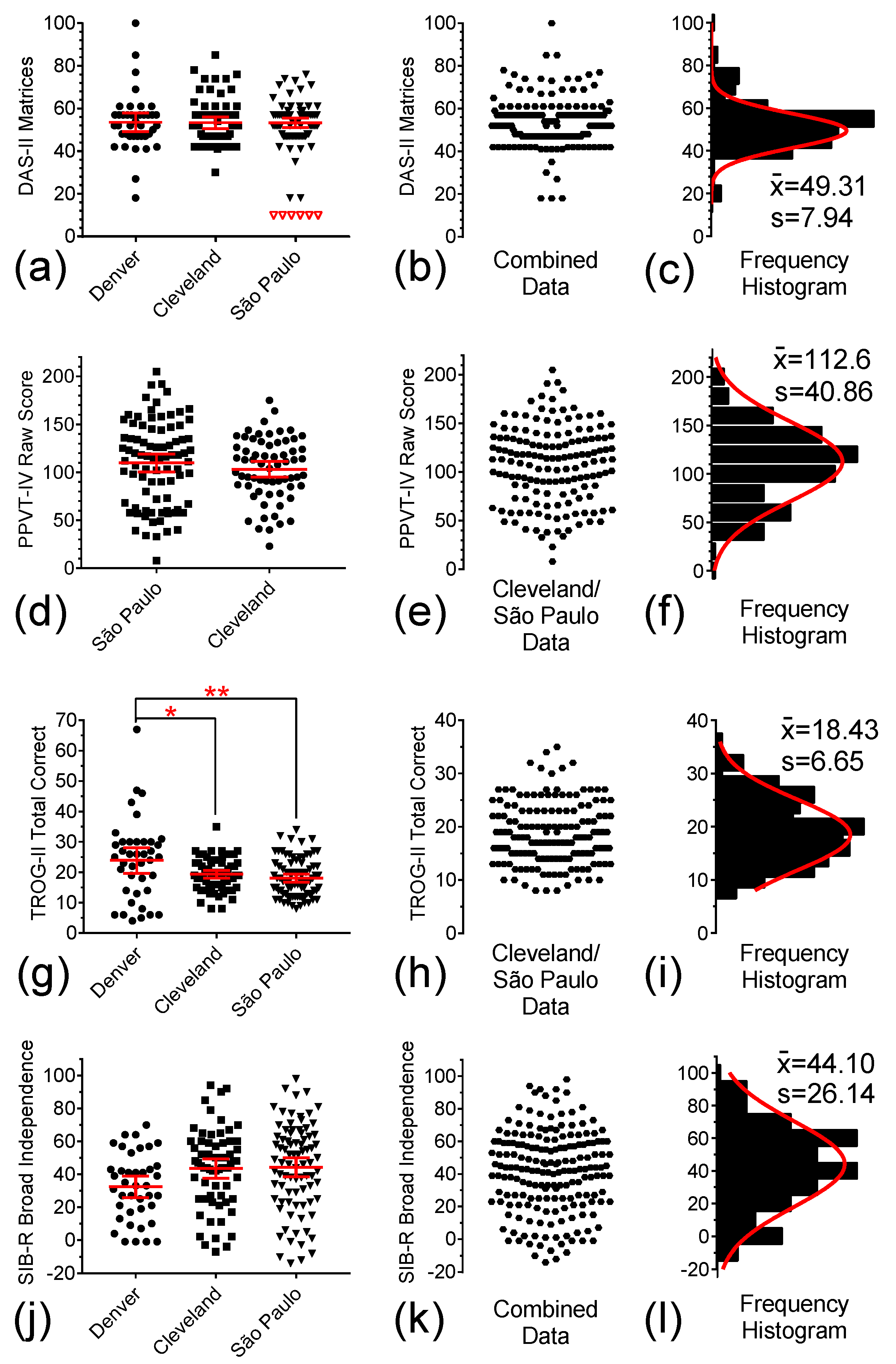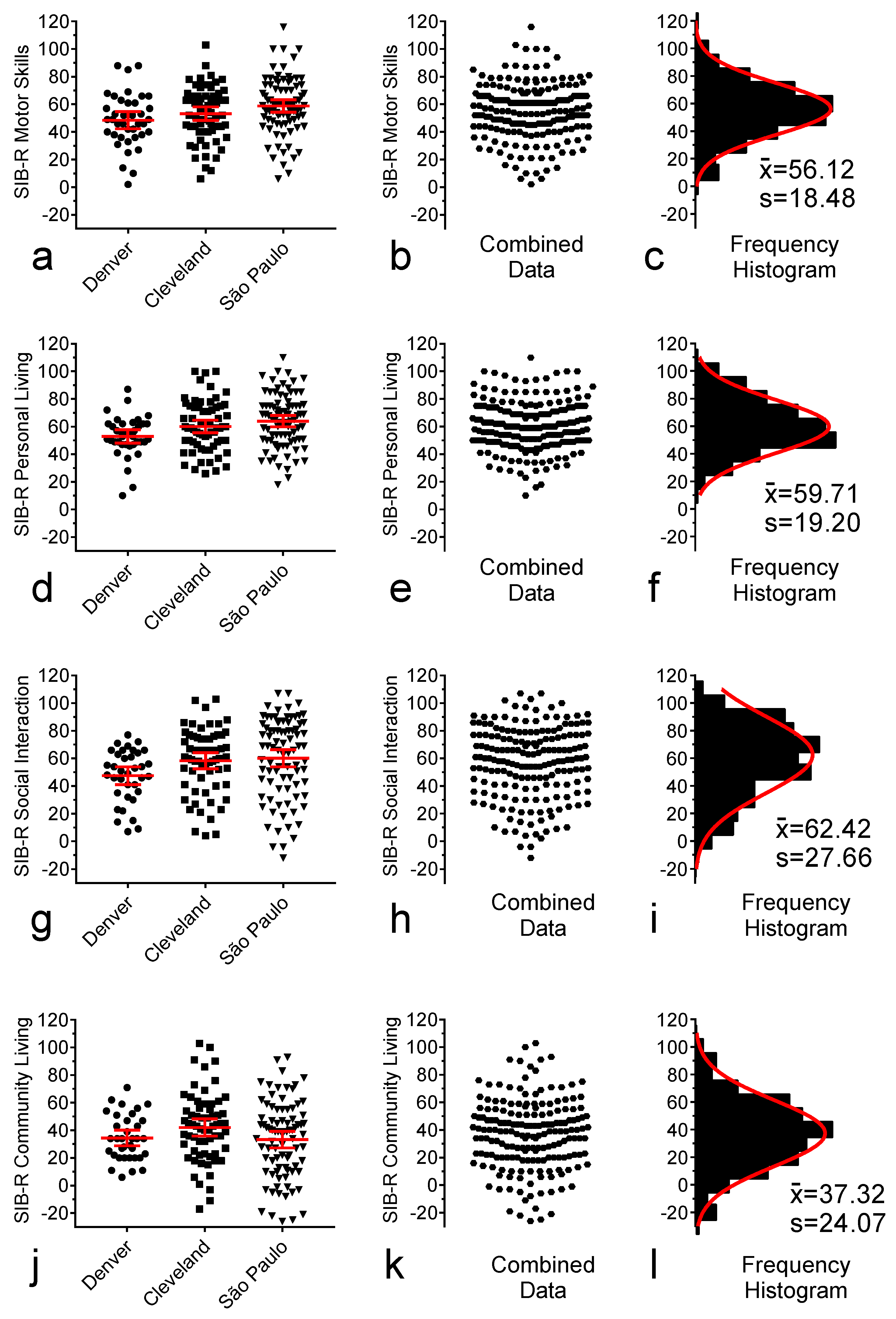 The SIB-R is considered an adequate tool for assessing adaptive functioning domains. It has a wide age range, good psychometric properties, and a history of being used in intervention trials in participants with DS [15]. Figure 4j depicts the distribution of individual SIB-R scores for the participants in the three study sites. Although ANOVA of these data hinted at location dependence (F(2, 185) = 3.058, p = 0.049), post hoc analysis failed to confirm any significant differences between the means of any two separate locations (Denver vs. Cleveland, p = 0.1159; Denver vs. São Paulo, p = 0.0565; Cleveland vs. São Paulo, p = 1.0000). Accordingly, data from these three sites were pooled, as shown in Figure 4k, and the resulting frequency histogram with a single Gaussian curve fitting is shown in Figure 4l.