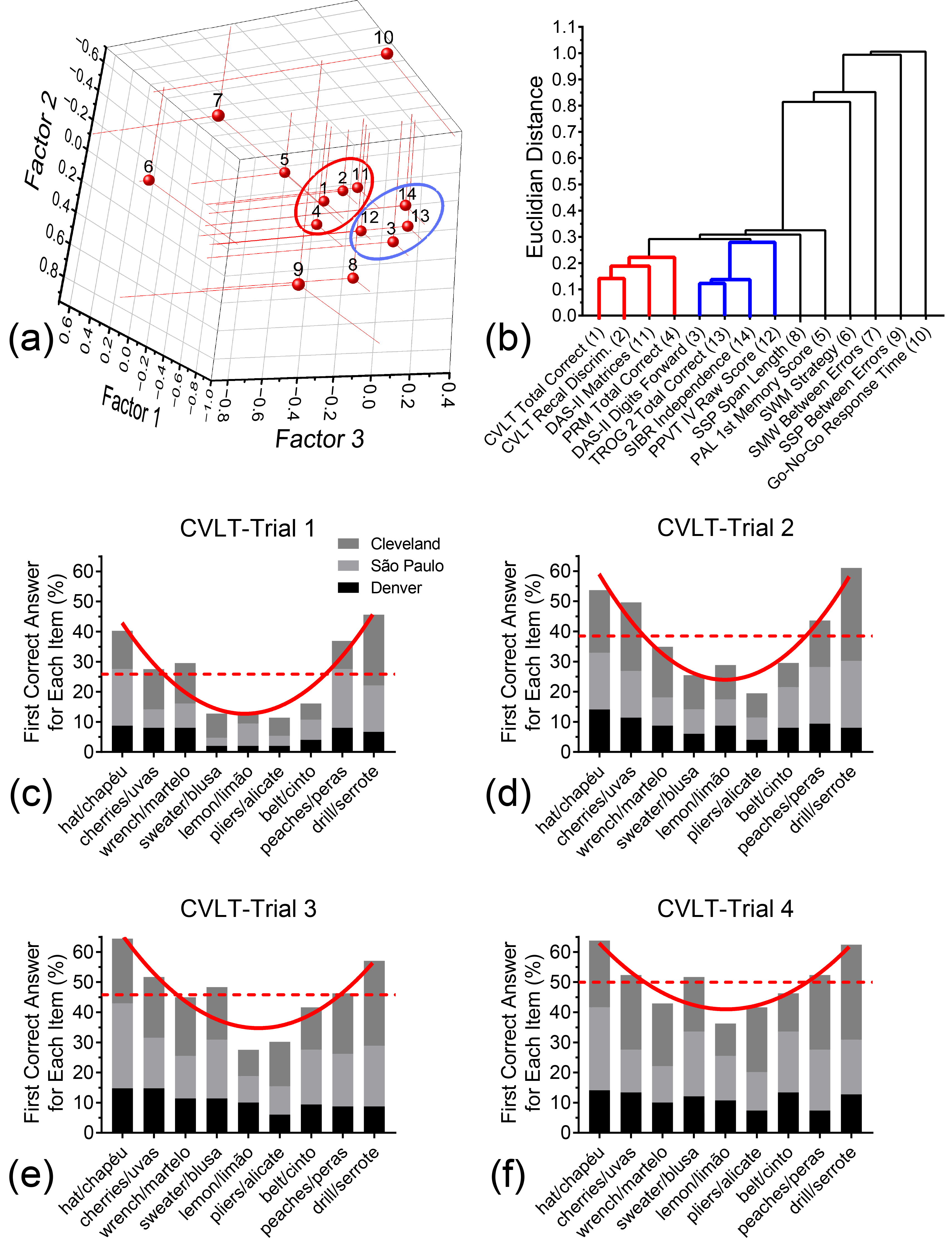 Primacy and recency effects are thought to represent an interaction in the recruitment of working memory and long term-memory systems required to recall supraspan word lists [31,32,33]. Evidence for such effects would suggest that participants are indeed making use of both working memory and longer-term storage to recall these word lists. Figure 4c–f show percentage counts for the first correct answer of each item according to their position in the list (1–9) for all three sites across trials 1–4, respectively. (Counts excluded repeated answers and intrusions.) In trial 1 [Figure 5c], recency effects were observed for CLVT-II sf list words in positions 8 and 9, whereas primacy effects were also observed for list words 1, 2, and 3. Similar to what has been reported for the Memory Assessment Scales (MAS) List [34], the typical U-shaped serial position curve diminishes with repeated exposure to the word list [Figure 5c–f].