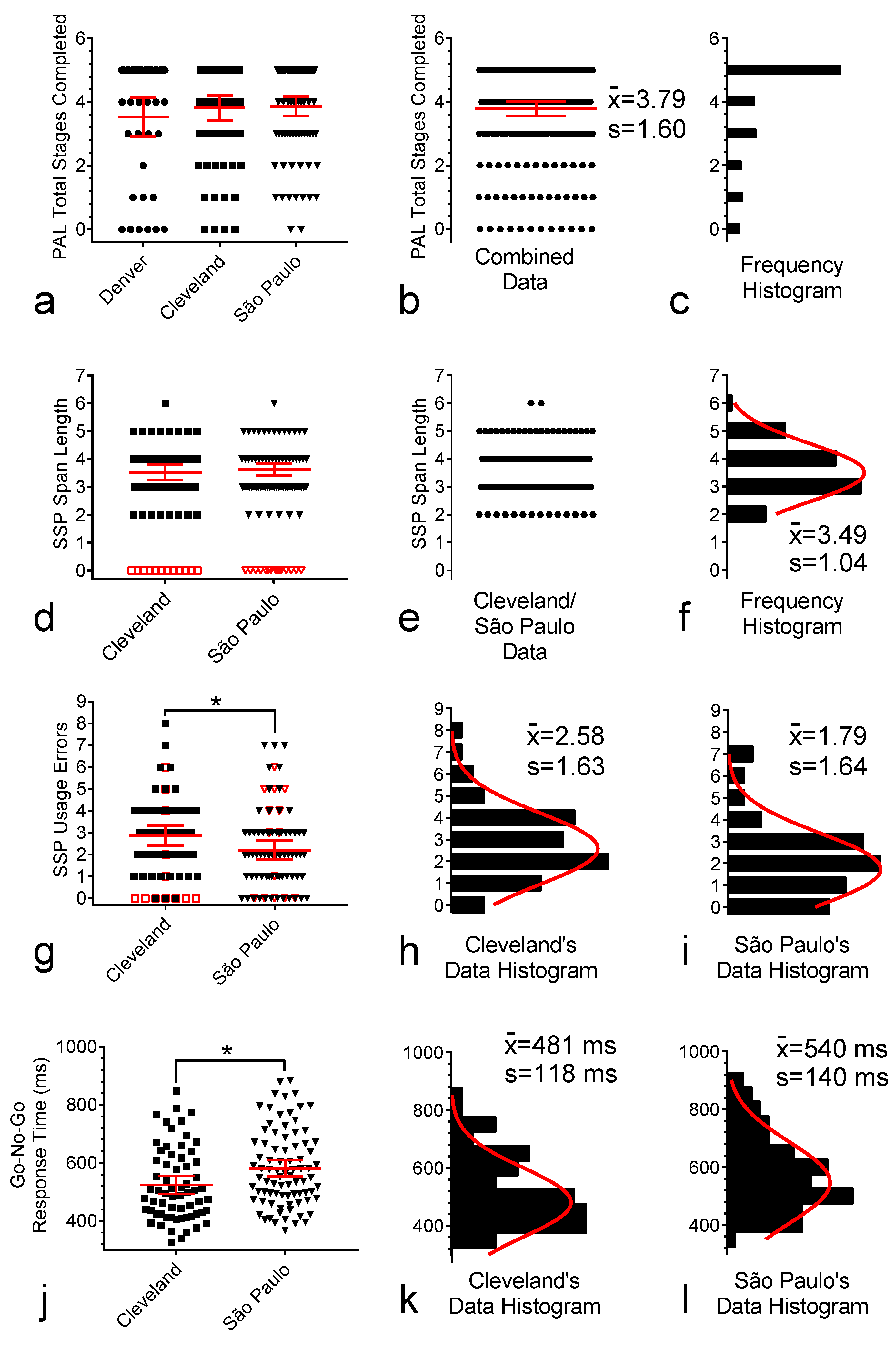 The CANTAB SWM is a convenient way to assess spatial working memory [26]. This task has been used in clinical trials and has been deemed an appropriate test in participants with DS [6]. Figure 3g,j depict the individual SWM Strategy and Between Errors subscores for the participants in the three study sites. No location effect was detected for this measure among the three study sites (Table 1), which led to the pooling of the data from the three sites into the graphs shown in Figure 3h,k and the frequency histograms and single Gaussian curve fittings shown in Figure 3i,l.
