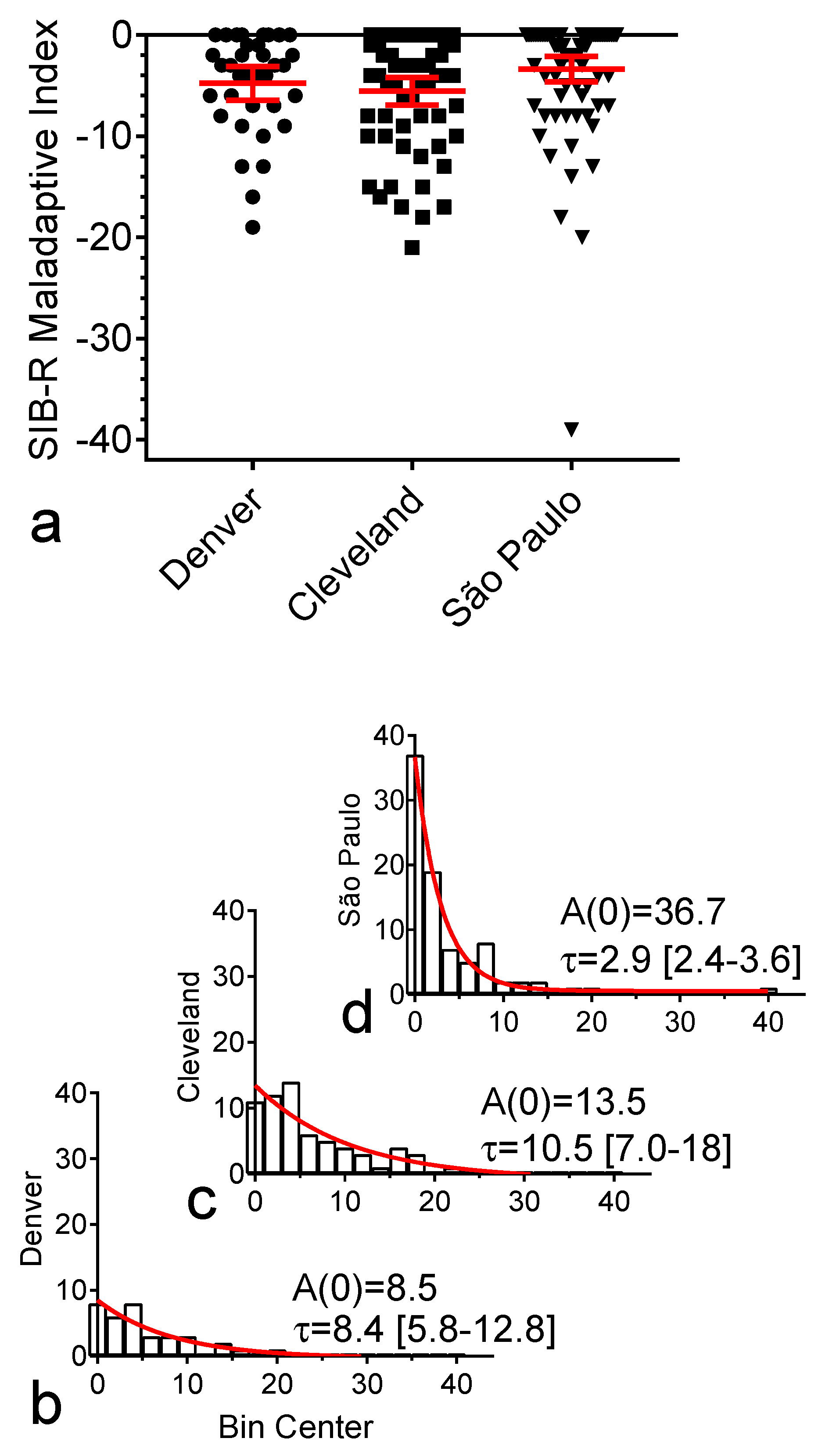 Although the ICC for the SIB-R Broad Independence score was in the good range (0.75), the observed increase in score from T1 to T2 in the placebo arm of the study was 14% (Cohen “d” = 0.231), which likely reflected parent/caregiver expectations for potential treatment effects. An arguably more interesting observation, however, was that the SIB-R’s Maladaptive Index scores frequency histograms were best fitted with a negative exponential function (Figure A3), which showed a significant shorter time constant (τ) (i.e., shorter distribution tail) for São Paulo (τ = 2.9 [95% CI 2.4 to 3.6]) compared to either Cleveland (τ = 10.5 [95% CI 7.0 to 18.0]) or Denver (τ = 8.4 [95% CI 5.8 to 12.8]). This indicated a lower frequency of maladaptive behaviors in the Brazilian site sample in relation to the two US sites and was the only hint of a potential cultural/environmental factor significantly affecting cognitive test results between these countries. Presently, the primary shortcoming of the SIB-R is that the questionnaire has not been updated in a few decades. Consequently, it now contains several outdated questions (e.g., the participant’s ability to use a payphone), which makes it understandable that other adaptive-skills instruments (such as the Vineland Adaptive Behavior Scales) have been gaining broader adoption in the fields of DS and ID in general.