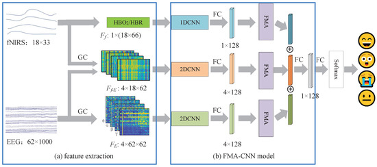 Figure 3 illustrates the proposed MFA-CNN framework for emotion recognition. After preprocessing, three feature streams are extracted: (i) GC-based EEG connectivity matrices, (ii) fNIRS hemodynamic features (HbO2/HbR), and (iii) EEG–fNIRS cross-modal GC features. Each stream is fed into a modality-specific encoder—a 1D–CNN for the fNIRS time series and 2D-CNNs for the matrix-form inputs—to obtain deep representations. A modality–frequency attention (MFA) module then adaptively reweights and fuses the three streams, and a Softmax classifier outputs the final emotion results.