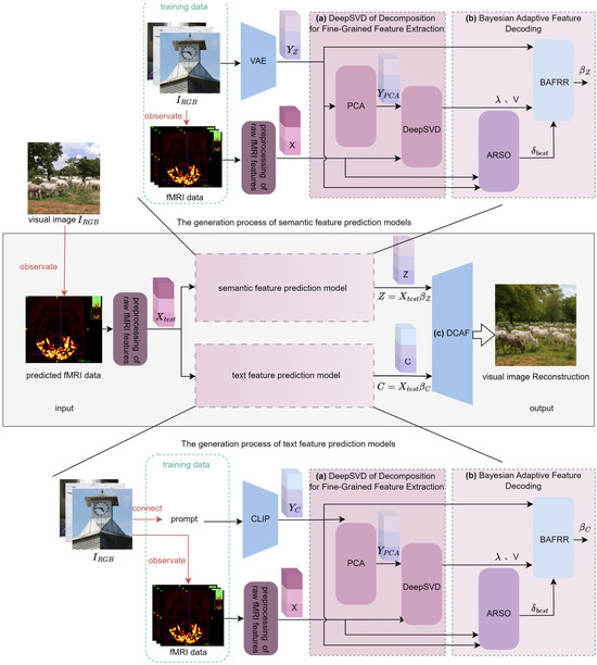 The proposed DCBAN algorithm framework is shown in Figure 1. Any fMRI data acquired during the observation of a visual image is used as the test data input for the proposed DCBAN model. After preprocessing the raw fMRI features, the resulting fMRI feature is separately input into the semantic feature prediction model and the text feature prediction model to obtain semantic features and text features , respectively. Both features are then input into the Dynamic Confidence Adaptive Fusion diffusion model (DCAF) to reconstruct the visual image corresponding to the fMRI data. As shown in Figure 1, the training structures of the semantic feature prediction model and the text feature prediction model are essentially the same. The primary difference lies in the data preprocessing related to the encoding features extracted from the training data. In the former model, the training data consists of visual images and fMRI data, where the visual images are encoded via a Variational Autoencoder (VAE) [43] to obtain the visual image semantic features . In the latter model, the training data consists of the average text annotations (prompts) related to the visual images and the fMRI data, where the prompts are encoded using CLIP [43] to obtain the visual image text features . In both prediction model training structures, the preprocessing of raw fMRI features, Deep Nested Singular Value Decomposition for fine-grained feature extraction, and Bayesian adaptive decoding processing are the same. The preprocessing of raw fMRI features is a standard foundational step that uses Generalized Linear Models (GLMs) to fit, denoise, and average the beta estimates corresponding to each viewing of the same image, thereby forming the feature data for visual image reconstruction. Clearly, the core components of the proposed DCBAN algorithm model are the Deep Nested Singular Value Decomposition for fine-grained feature extraction, Bayesian adaptive feature decoding, and the Dynamic Confidence Adaptive Fusion diffusion model, as described in three parts below.