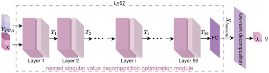 - To further enhance the independence and effectiveness of feature representation, the singular vectors and at layer i are subjected to stronger constraints by the low-rank constraint objective function . The low-rank constraint objective function consists primarily of the signal matching term, regularization term, and orthogonality constraint term [46], as shown in Equation (1).