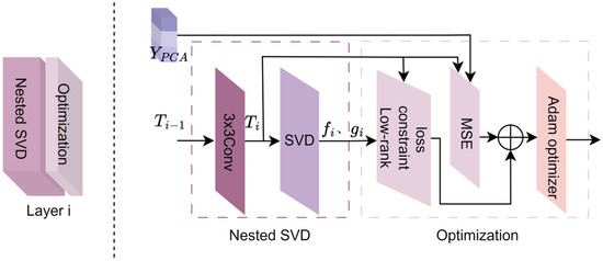 As an example, the operation of the nested singular value decomposition optimization module is illustrated using the layer i (where ) in Figure 3. The process mainly consists of six steps: convolution, SVD, low-rank constraint loss, mean squared error (MSE), loss combination, and Adam optimization.