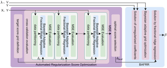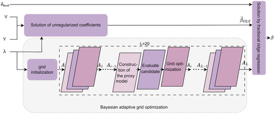 The traditional fixed α-grid method is commonly used in ridge regression for the search of regularization parameters. However, due to its inability to dynamically adapt to the distribution of data features, it often results in grids that are either too sparse or too dense, leading to wasted computational resources or the omission of the optimal parameter choice. To address this issue, the Bayesian Adaptive Fractional Ridge Regression (BAFRR) method has been proposed. The specific process is illustrated in Figure 5 and is divided into three main steps: solving for the unregularized coefficients, singular value-driven Bayesian adaptive grid optimization, and solving for the optimal target score using fractional ridge regression. As the core of the method, Bayesian optimization dynamically adjusts the grid precision using a Gaussian process surrogate model and acquisition function, iterating L times (where L = 20) to optimize α, thereby enhancing both search efficiency and generalization ability.