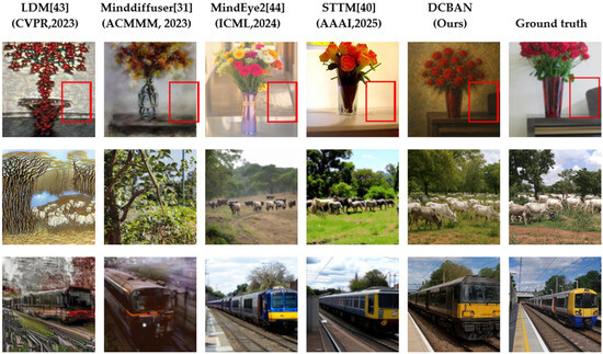 To visually and intuitively illustrate the contribution of each key module in the proposed DCBAN method to the overall performance, an ablation experiment on the reconstructed visual image was conducted using the NSD, as shown in Figure 10.