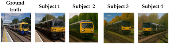 Qualitative Comparison of Reconstruction Images Obtained from Models Trained on fMRI Data Corresponding to Randomly Selected Ground-Truth Visual Stimuli. The first column shows ground-truth images (i.e., the visual image stimuli corresponding to the fMRI data). Each of the columns for Subject 1, Subject 2, Subject 3, and Subject 4 displays the reconstruction images generated from fMRI data acquired when different subjects viewed the same visual stimulus.
