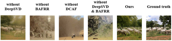 Through ablation experiments, we further verified the crucial role of each module in DCBAN, as shown in Figure 10 and Table 3. The results indicate that the DeepSVD module is essential for detail recovery and the reconstruction of low-level structures, the BAFRR module enhances the model’s adaptability, ensuring stability in the decoding process, and the DCAF module improves the detail and naturalness of the image generation phase. Removing any of these modules significantly reduces the reconstruction quality, particularly in complex scenes, where the removal of DCAF causes the generated images to lose rich details and semantic consistency. Therefore, the three key modules of DCBAN are interdependent and indispensable.