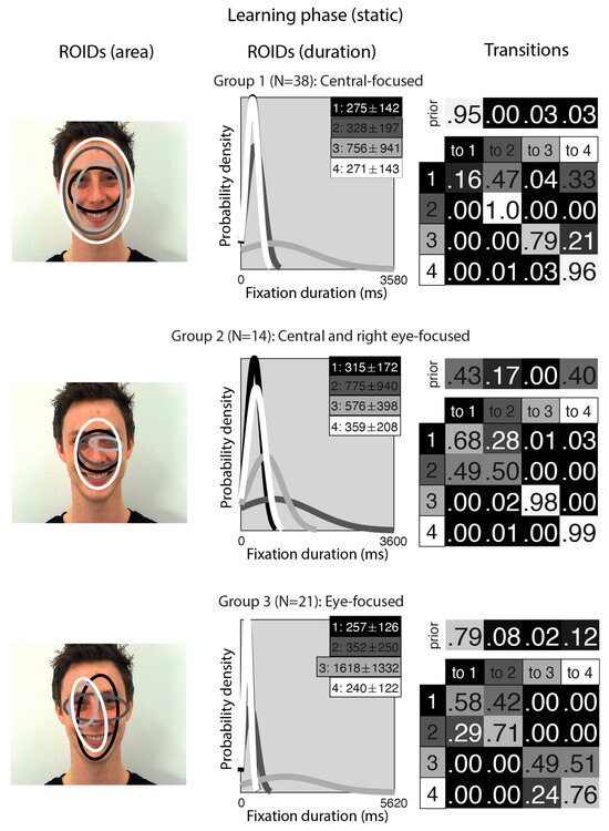 Unsurprisingly, the clusters that emerged from the analysis of the learning stage (Figure 5) closely resembled those from the separate analyses of the learning stage conditions. In the Central-focused group (Group 3, 57 datapoints), all four ROIDs were focused around the centre of the face, and participants tended to direct most fixations to the ROIDs that encompassed the inner features (1: black) or the entire face (2: dark grey). In the Eye-focused group (Group 2, 69 datapoints), participants tended to begin by fixating on the upper nose and eye region and frequently transitioned from there to the eye region. The final group, which we call Central and left eye-focused (Group 1, 20 datapoints), resembled the Central and right eye-focused group from the initial analysis of static faces, but with an ROID centred on the left eye instead of the right eye.